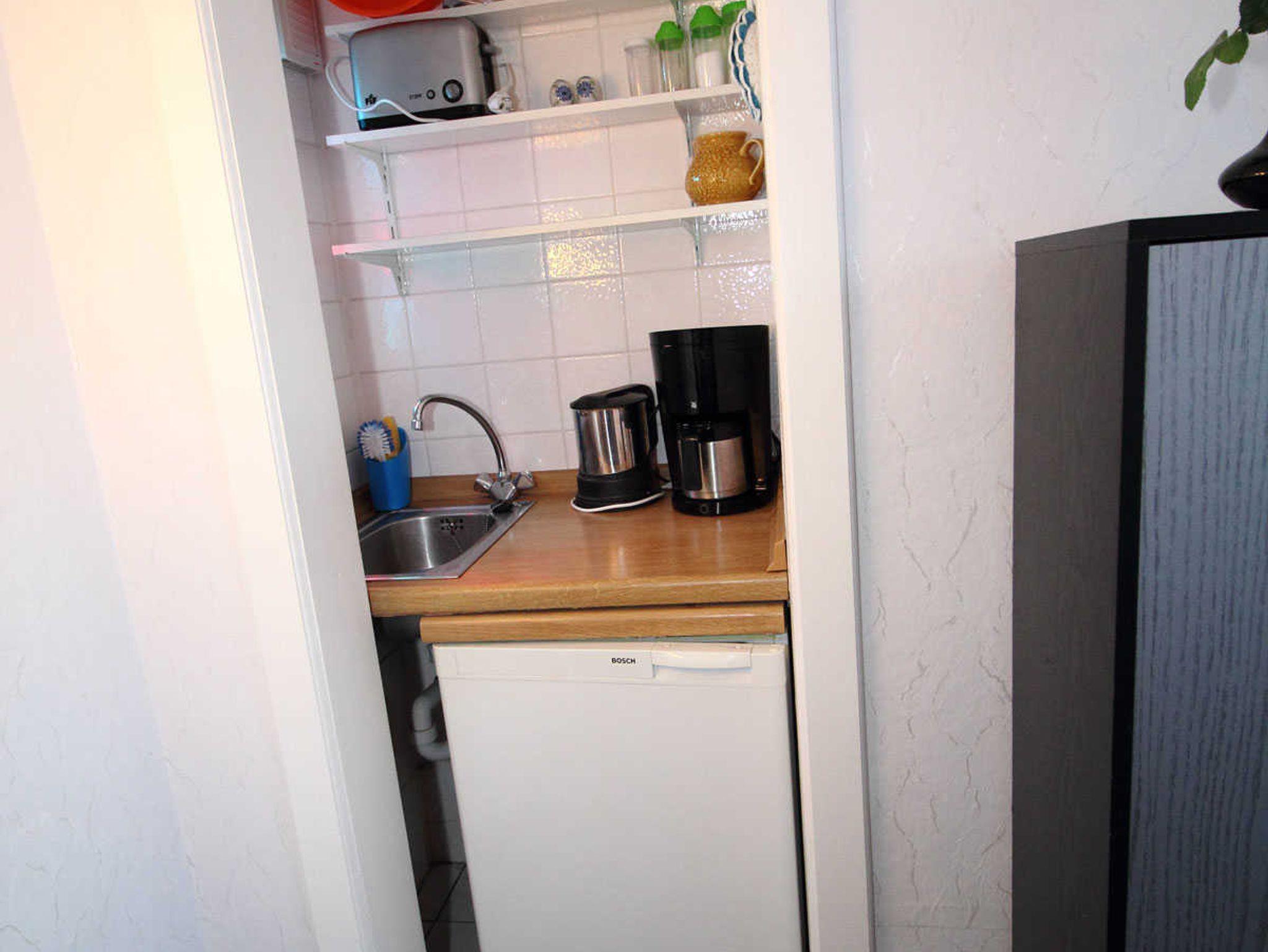 - Die integrierte Miniküche ist ausgestattet mit Mikrowelle (mit Kochplatte), Kühlschrank und Kaffeemaschine. Weiterhin befindet sich ein Esstisch mit 3 Stühlen im Wohnbereich.