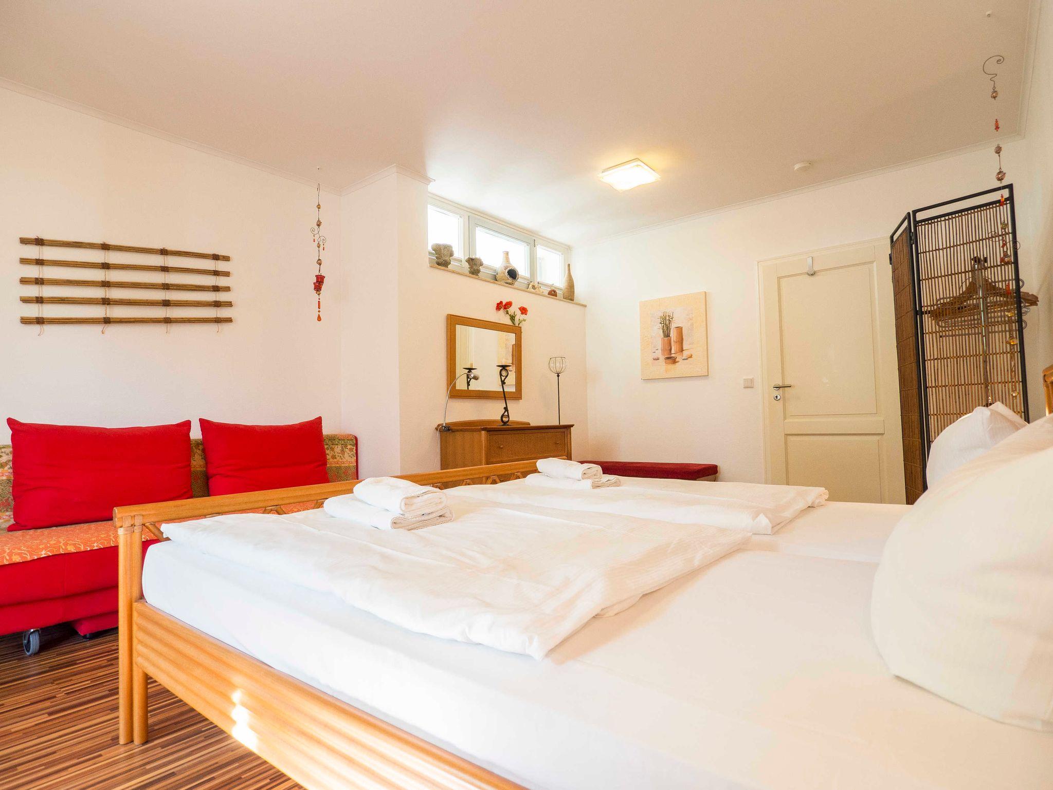 Das Schlafzimmer ist eingerichtet mit einem Doppelbett und einem ausziehbaren Schlafsofa. Es verfügt darüberhinaus über eine Kommode und ausreichend Möglichkeiten, die Urlaubs-Gardarobe zu verstauen. Ein zweites Fernsehgerät ist ebenfalls vorhanden.