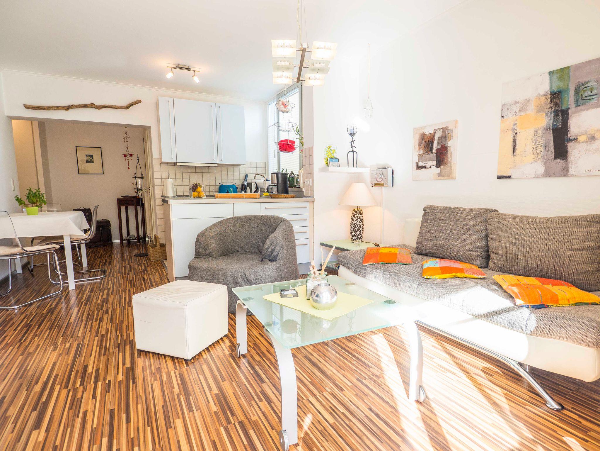 Das moderne, mit viel Liebe eingerichtete Appartement bietet viel Raum, um sich zu entfalten, Zeit für Sinnesfreuden und zum Erholen. Der Wohnraum verfügt über eine komplett eingerichtete Wohnküche mit Essecke und eine gemütliche Sitzgruppe (Schlafcouch und Aufbettung für 4 Person möglich) lädt zum Verweilen bei einem Glas Wein, zum Fernsehen oder Musikhören ein.