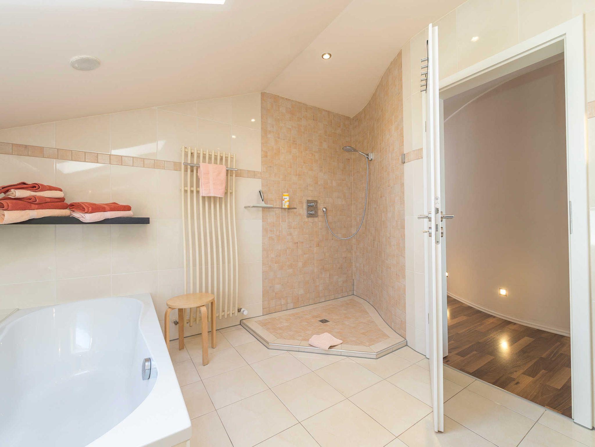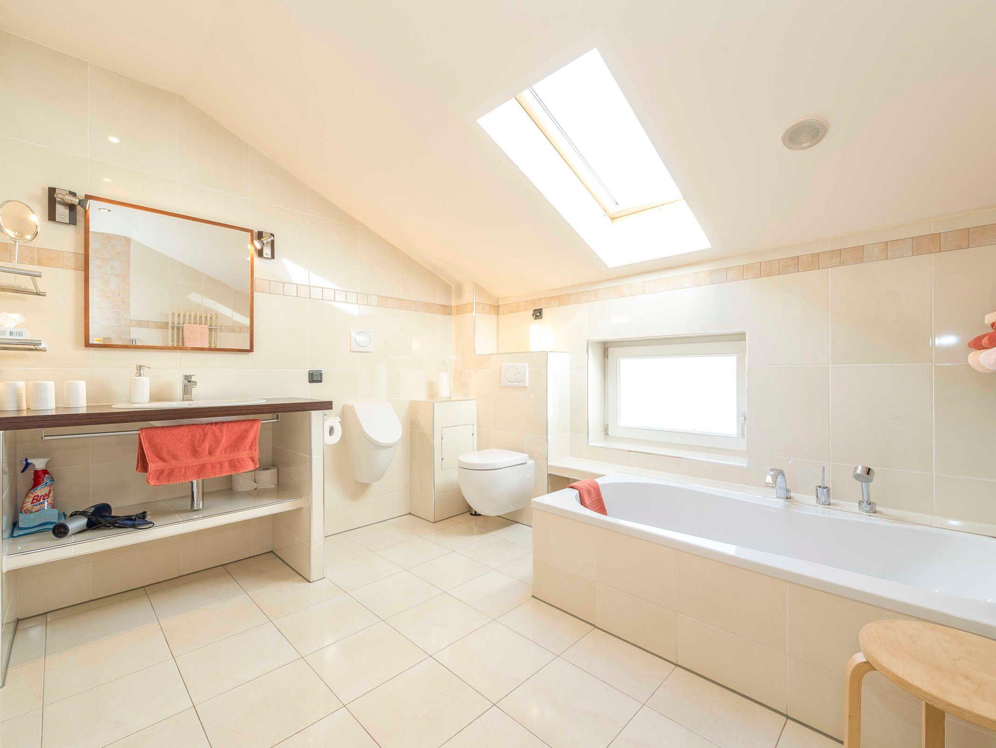 • Extravagantes Badezimmer mit großer Badewanne, ebenerdiger Dusche, WC, Urinal, Haartrockner, Kosmetikspiegel, Handtuchheizung, Fußbodenheizung