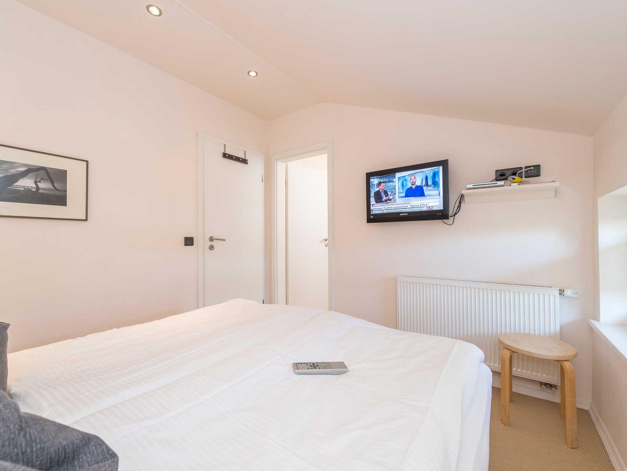 • Schlafzimmer mit Doppelbett (1,60 m x 2 m), LED-Fernseher und begehbarem Kleiderschrank