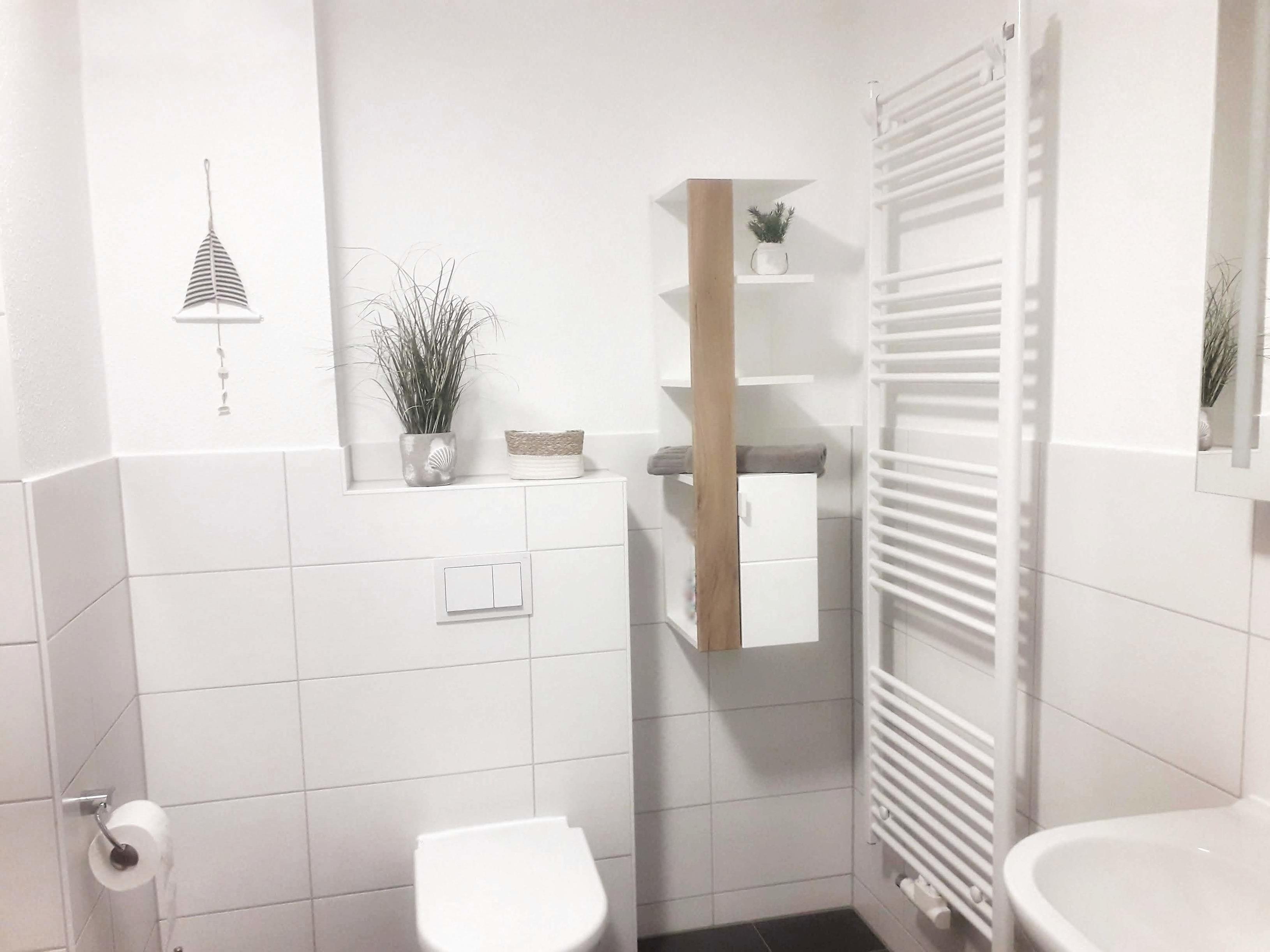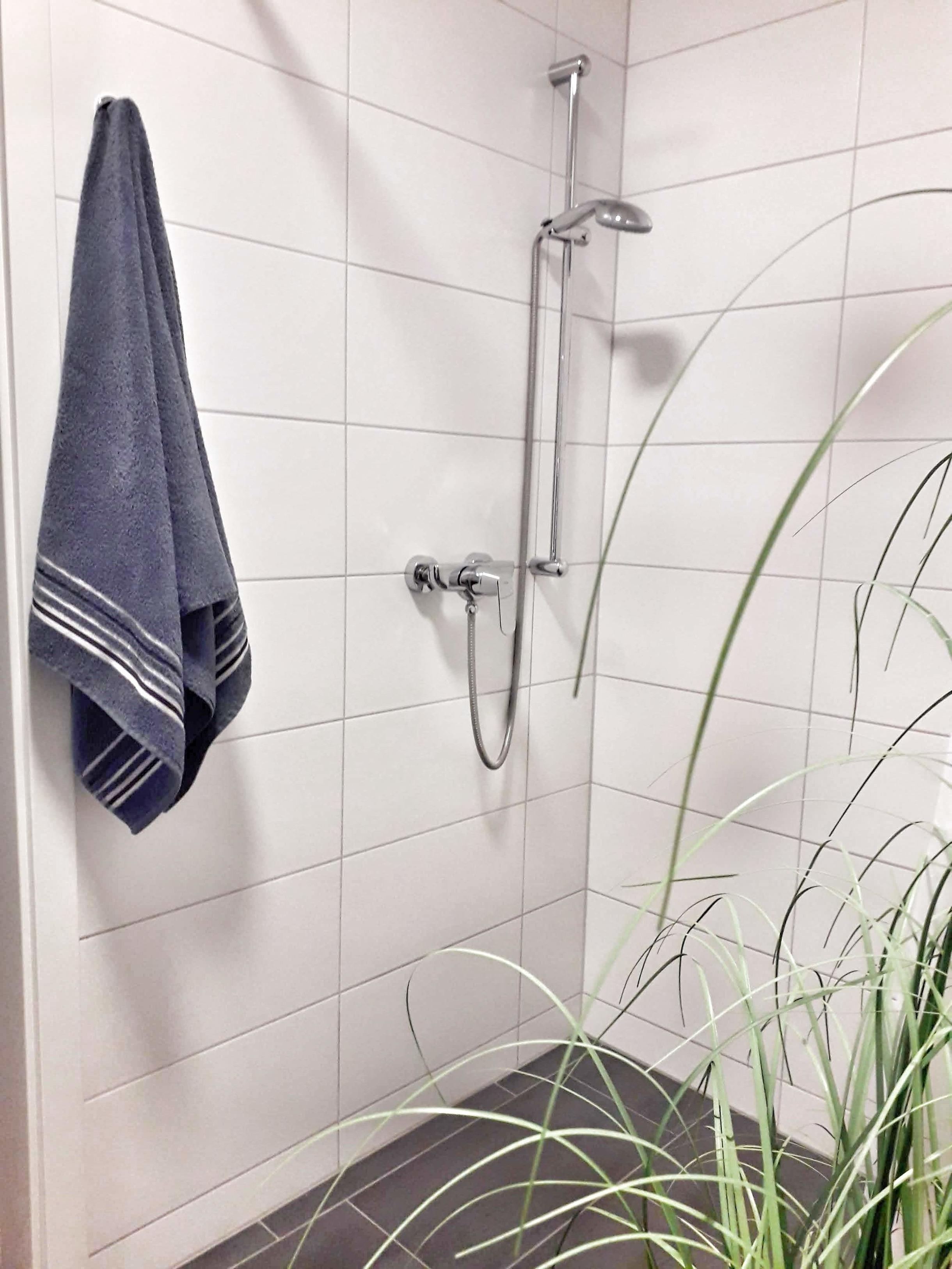 Das Bad bietet behagliche Fußbodenheizung, Handtuchheizkörper und eine großzügige ebenerdige Dusche.