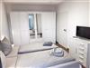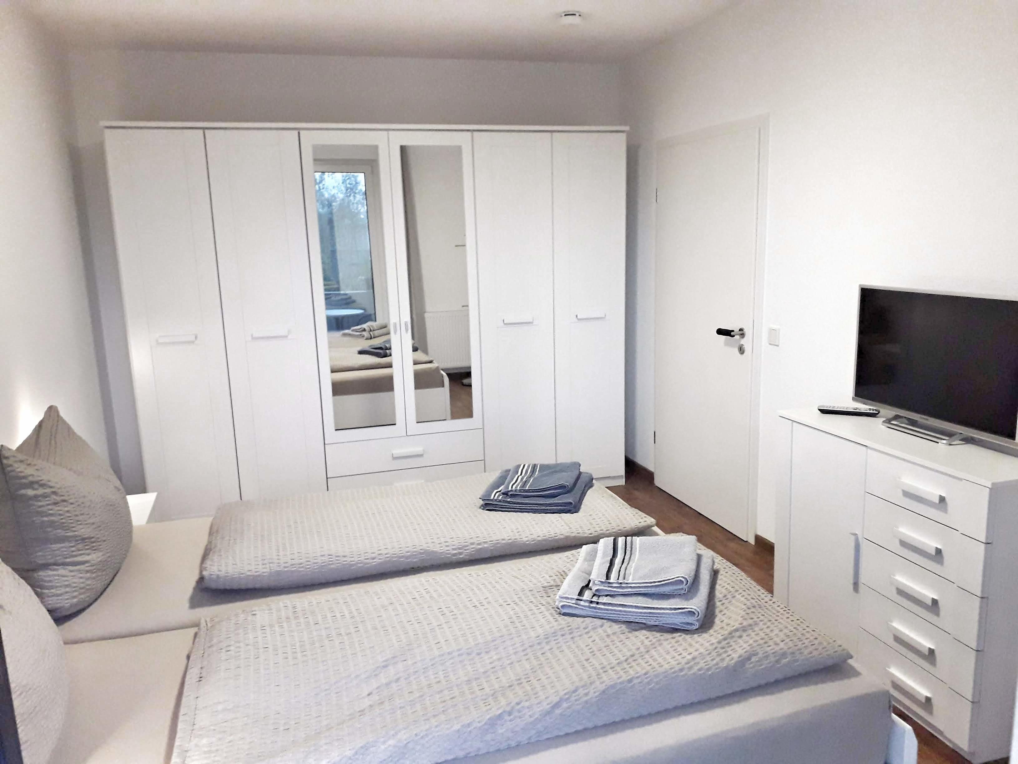 Das Schlafzimmer mit 6-türigem Kleiderschrank, Kommode und Flachbildfernseher hat Zugang zum Balkon.