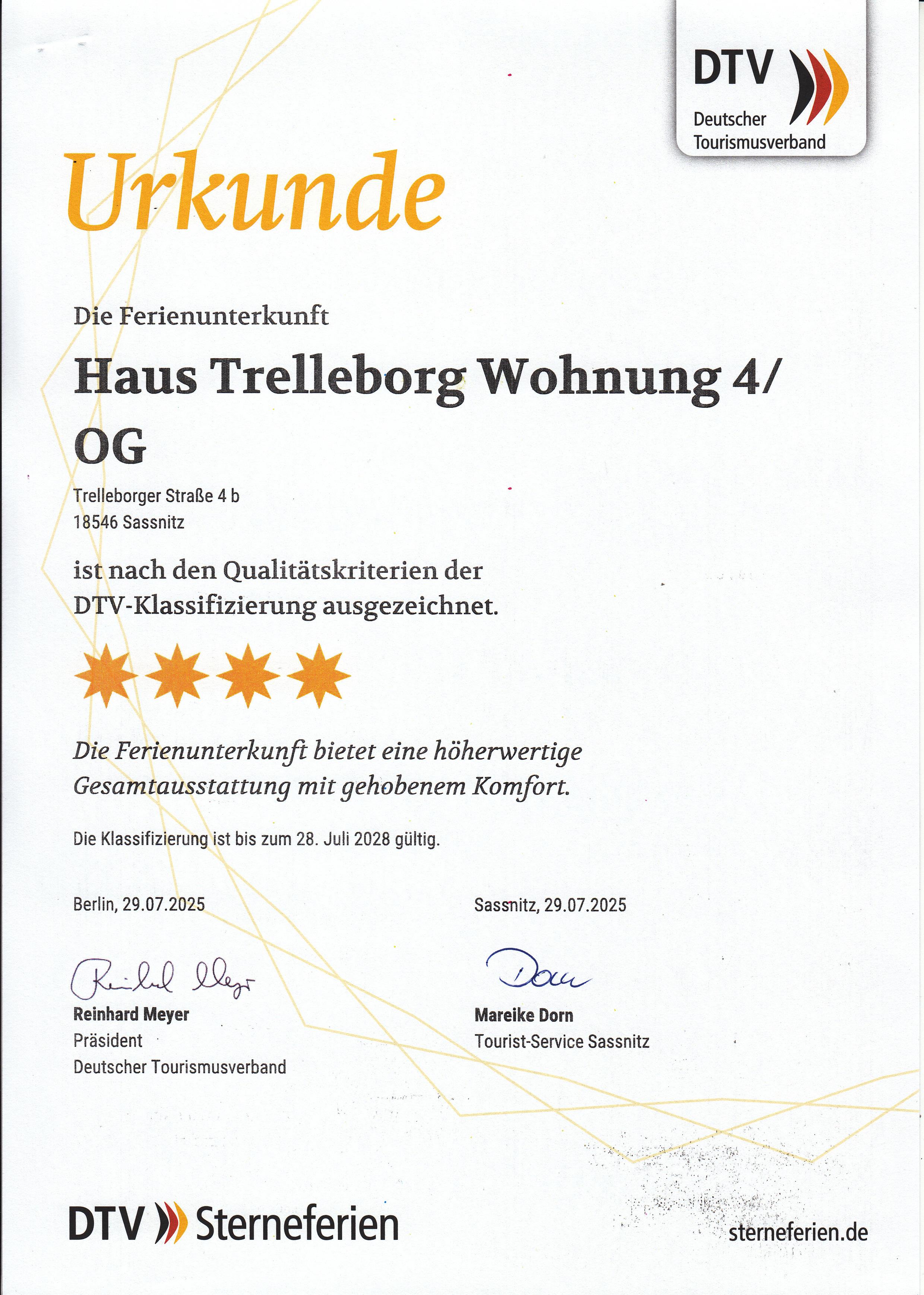 Die 60 m ² große und mit 4 DTV Sternen klassifizierte Ferienwohnung 4 befindet sich auf der linken Seite im Obergeschoss im Ferienhaus Trelleborg. Sie bietet mit ihren drei Zimmern ausreichend Platz für bis zu 4 Personen.
