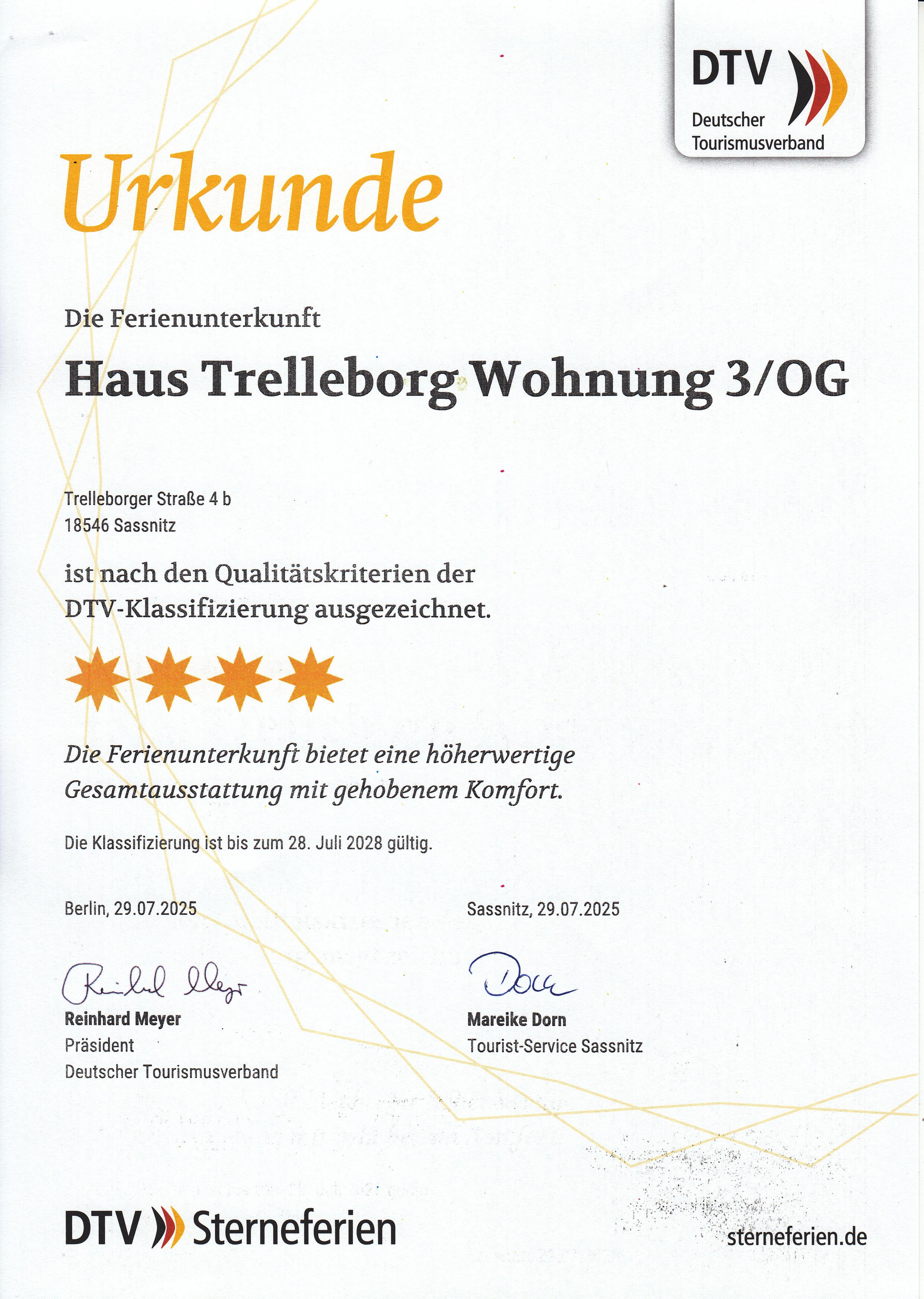 Die 60 m ² große und mit 4 DTV Sternen klassifizierte Ferienwohnung 3 befindet sich auf der rechten Seite im Obergeschoss im Ferienhaus Trelleborg. Sie bietet mit ihren drei Zimmern ausreichend Platz für bis zu 5 Personen.