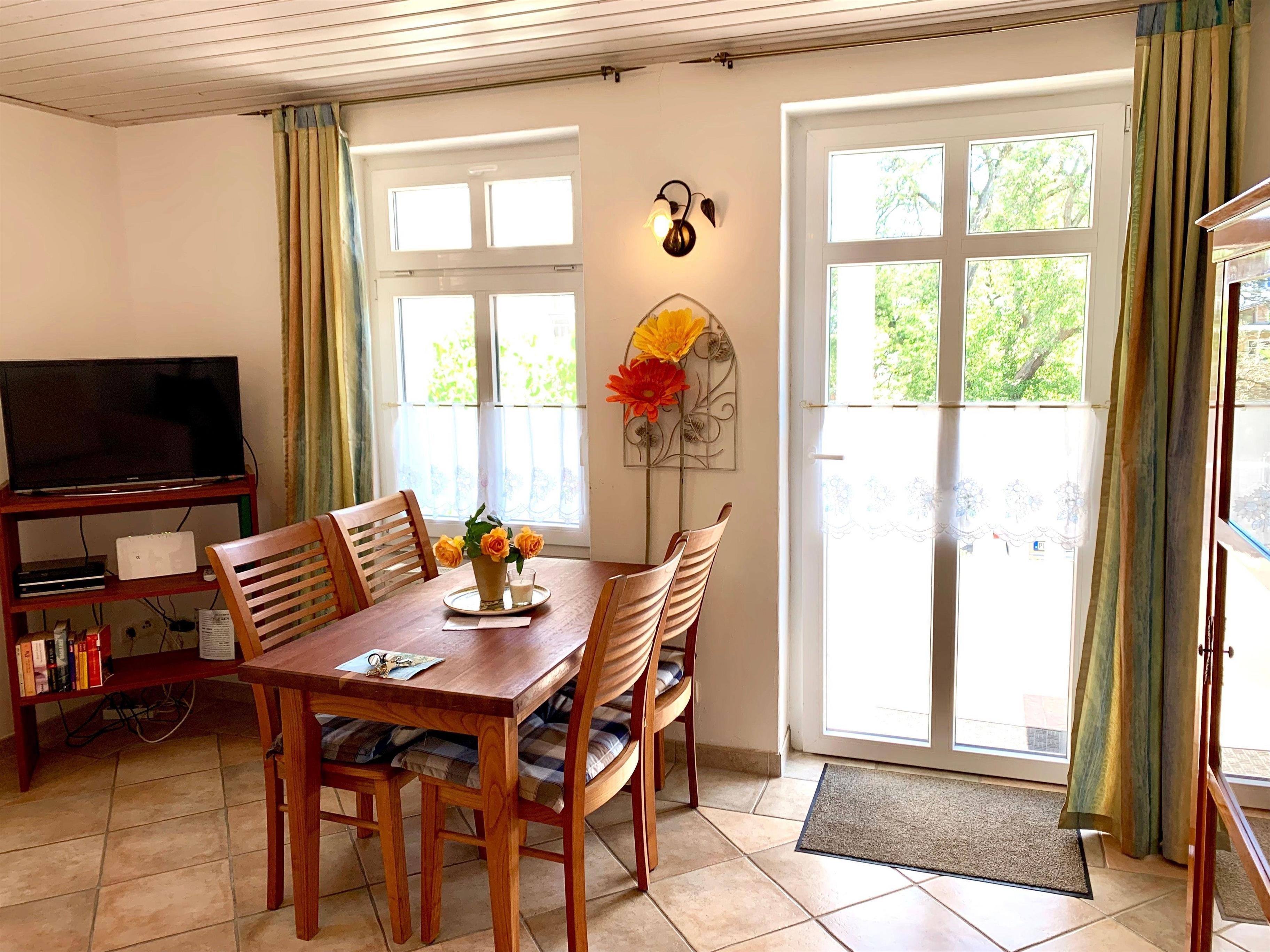 Zur Ferienwohnung gehören eine Terrasse mit Blick in die Sassnitzer Altstadt mit Zugang zum Wohnzimmer und ein gemütlicher Innenhof mit Sitzgelegenheit zum Verweilen. Ein Parkplatz befindet sich direkt am Haus, eine Seltenheit in der Sassnitzer Altstadt.