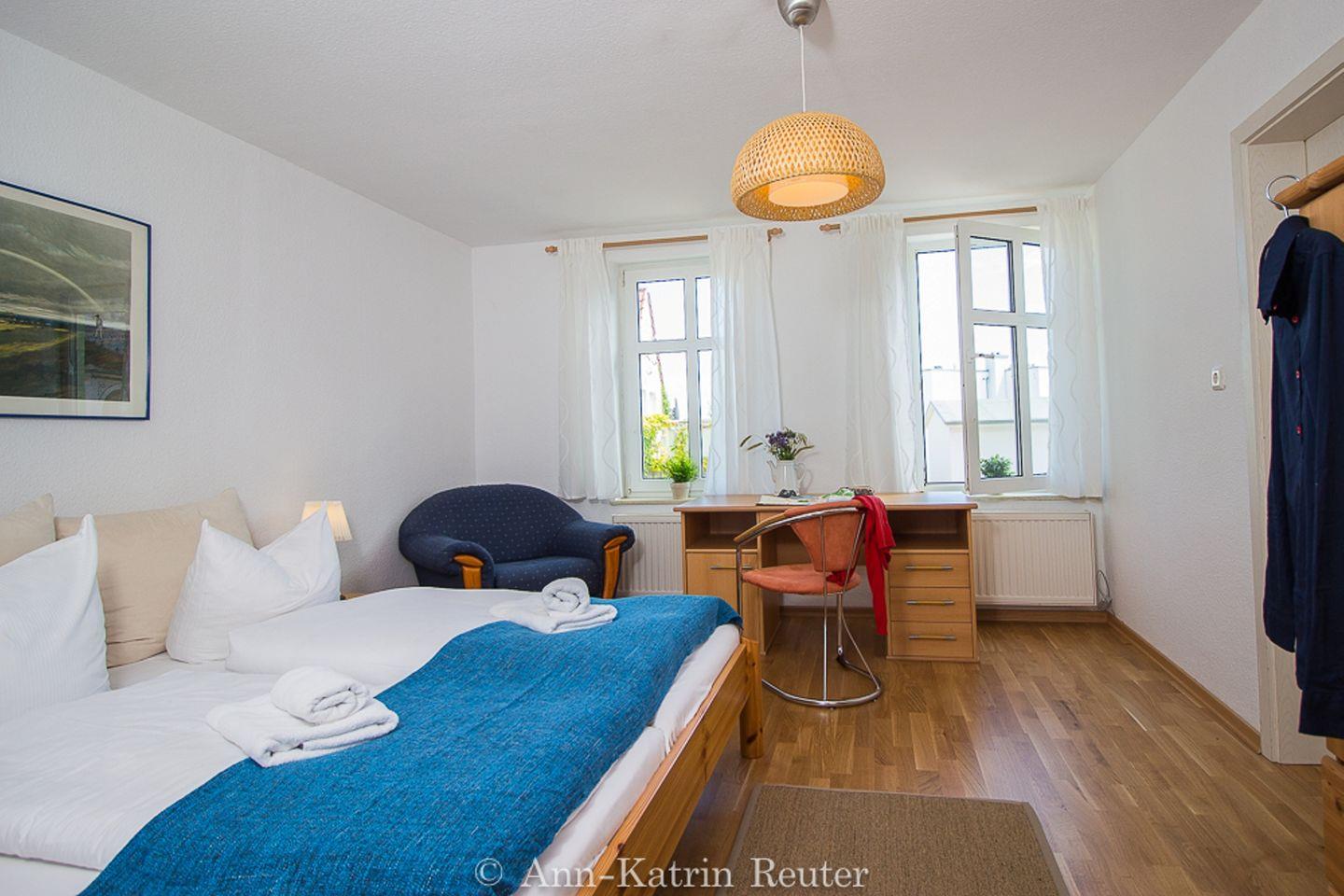 Die komfortable Ferienwohnung "Strandluft" befindet sich in der ersten Etage des historischen Hauses und hat eine Größe von ca. 43 qm. Das helle Schlafzimmer ist mit einem Doppelbett, einem Sessel, einem Kleiderschrank und einem Schreibtisch ausgestattet. Aus dem Fenster des Schlafzimmers können Sie sogar einen Blick auf die Ostsee erhaschen. Im gemütlich eingerichteten Wohnbereich des Appartements finden Sie eine bequeme Sitzecke mit Schlafcouch und Flachbildfernseher sowie einen Esstisch mit 4 Stühlen. Die kleine Pantryküche ist in die Diele der Wohnung integriert. Das großzügige Tageslichtbadezimmer verfügt über eine Dusche und eine Waschmaschine. Da sie in der Küche keinen Platz mehr gefunden hat, befindet sich hier sogar noch die Geschirrspülmaschine. Die Wohnung verfügt über einen kostenfreien WLAN-Zugang und einen PKW Stellplatz. Dieser ist aber nicht direkt am Haus sondern befindet sich etwa 350 m entfernt auf einem Parkplatz.