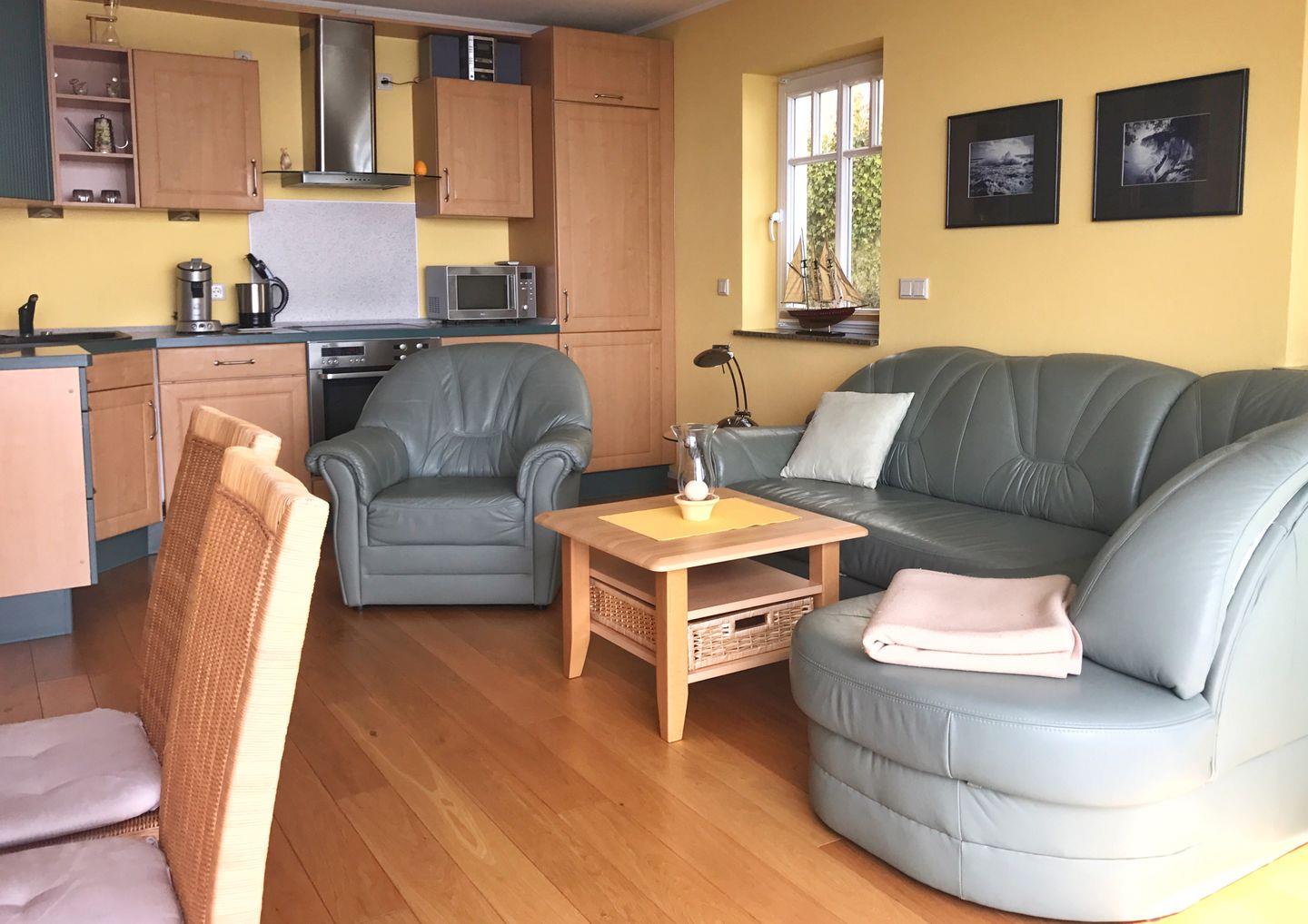 Die 2-Zimmer-Ferienwohnung befindet sich im Erdgeschoss des Appartementhauses "Prinz Heinrich" und gliedert sich in einen Wohnbereich mit tollem Panorama-Meerblick, ein gemütliches Schlafzimmer sowie eine Badezimmer. Vom Wohn- und Essbereich des hellen Appartements, der über eine offene und komplett ausgestattete Küchenzeile verfügt, können Sie über große, bodentiefe Fenster einen traumhaften Blick auf die Ostsee und den Stadhafen Sassnitz genießen. Die bodentiefen Fenster lassen sich großflächig öffnen und ermöglichen den Zutritt zu der nach Süden ausgerichteten, überdachten Terrasse und dem kleinen, der Wohnung zugehörigen, Gartenanteil mit eigenem Strandkorb. Maximal kann dieses tolle Appartement 4 Personen beherbergen, wobei das Schlafzimmer mit großem Doppelbett und Flachbildfernseher über Schlafmöglichkeiten für 2 Personen verfügt und die gemütliche Schlafcouch im Wohnbereich zwei weiteren Personen Schlafplätze bietet. Das Tageslichtbadezimmer des komfortablen Appartements ist mit einer ebenerdigen Glasdusche, Waschbecken und natürliche einem WC ausgestattet. Die Wohnung verfügt über einen eigenen Stellplatz am Haus. Fahrradunterstellmöglichkeit vorhanden.
