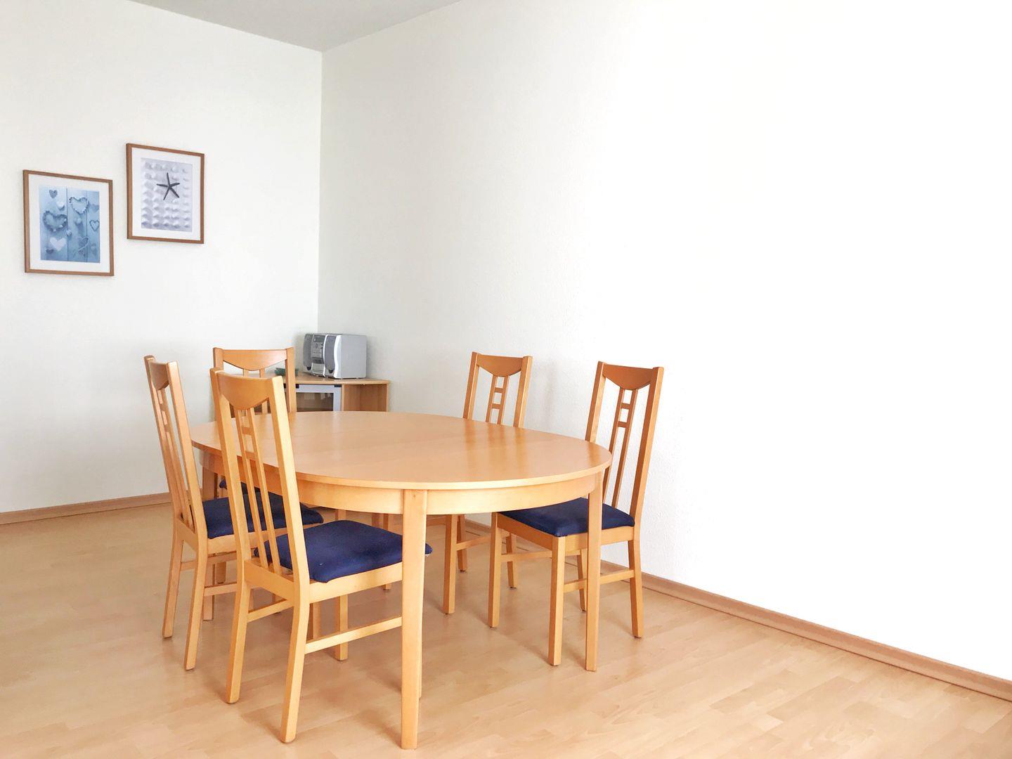 Die Wohnung befindet sich im 2.OG und bietet Platz für 4 Personen. Sie besteht aus insgesamt 3 Zimmern auf ca. 100 qm Wohnfläche: ein Schlafzimmer mit Doppelbett ; ein Schlafzimmer mit Schlafcouch für 2 Personen; ein Wohn-Esszimmer mit Flachbildschirm-TV sowie ein Bad mit Dusche und WC, einer Küche und einem Abstellraum. Die separate Küche ist ausgestattet mit Ceranfeld, Backofen, Mikrowelle, Kühlschrank, Gefriermöglichkeit, Kaffeemaschine, Toaster und Wasserkocher. Zur Wohnung gehört ein Pkw-Stellplatz am Haus.