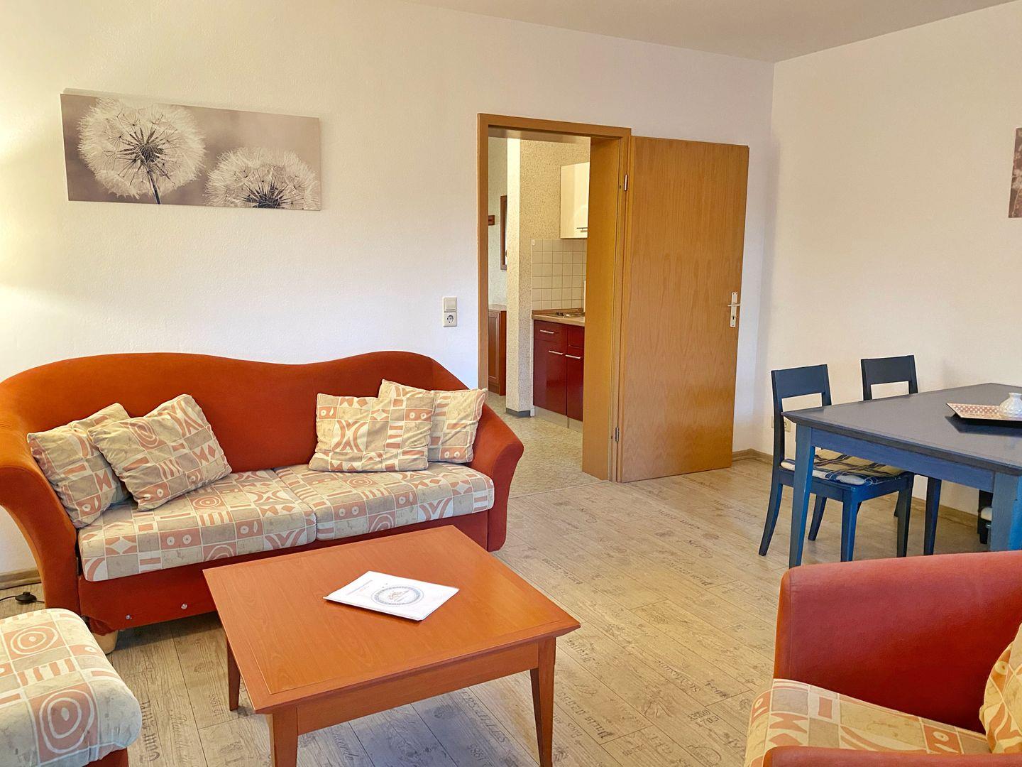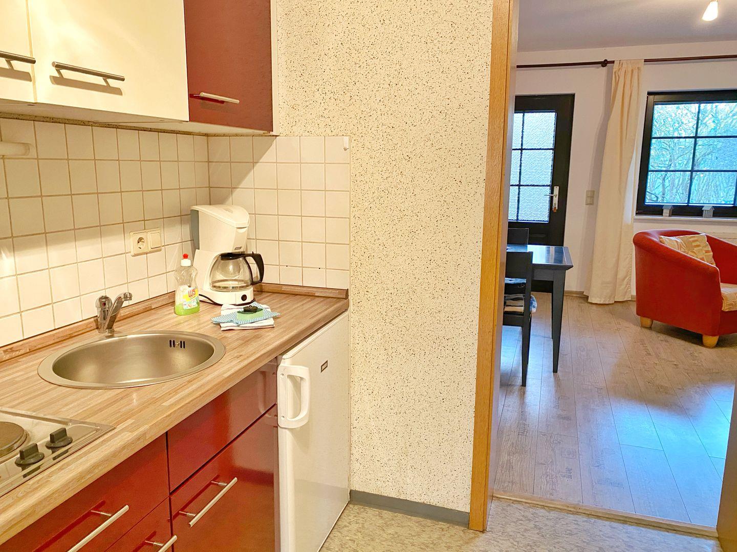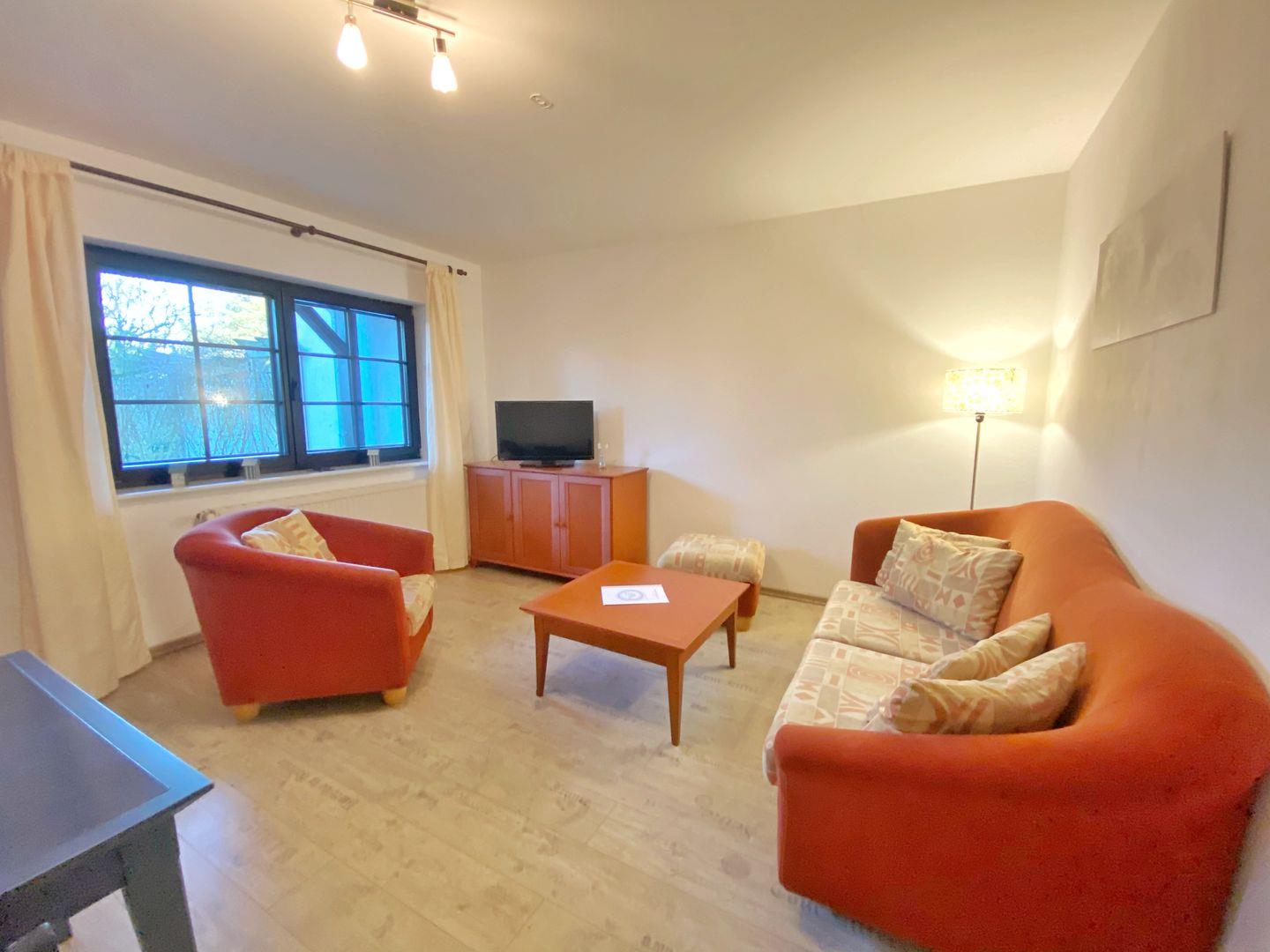 Die gemütliche Ferienwohnung hat eine Grundfläche von ca. 40 m² und unterteilt sich in einen Wohnraum mit Doppelbettcouch, einem Essbereich und Flachbild-TV, ein Schlafzimmer mit Doppelbett und Kleiderschrank, einen Flur mit Miniküche (Kühlschrank, 2 Kochplatten, Kaffeemaschine, Wasserkocher, Toaster) und ein Badzimmer mit Dusche und WC.
