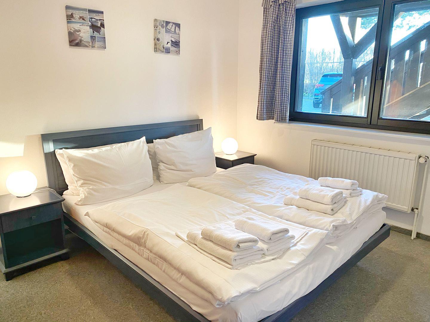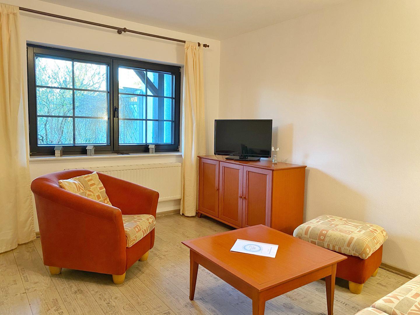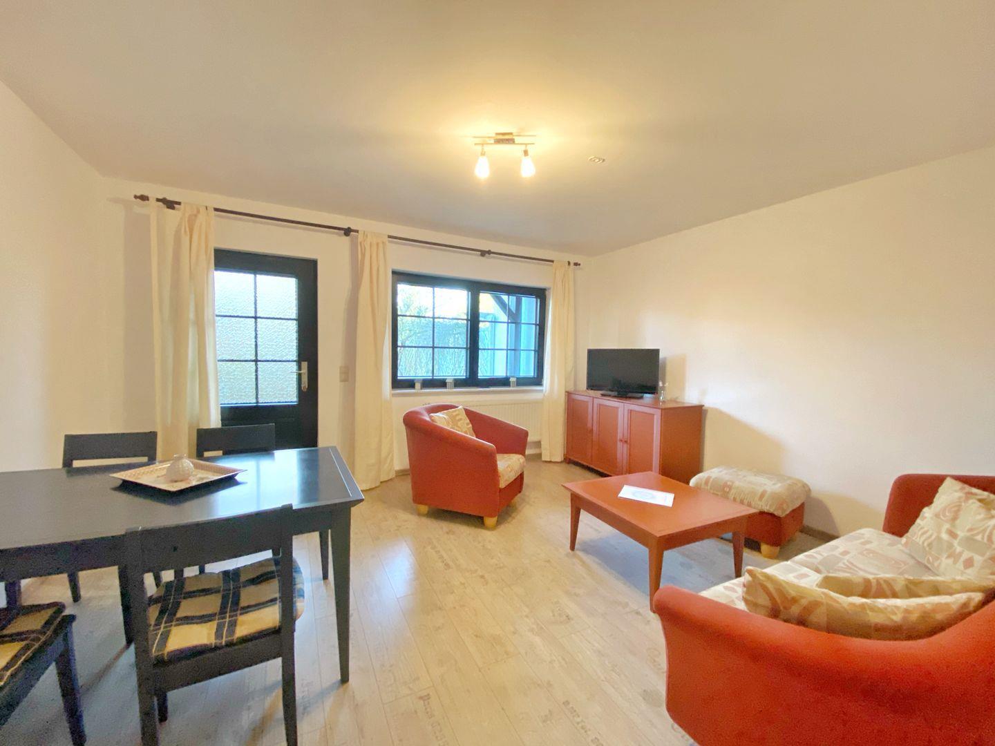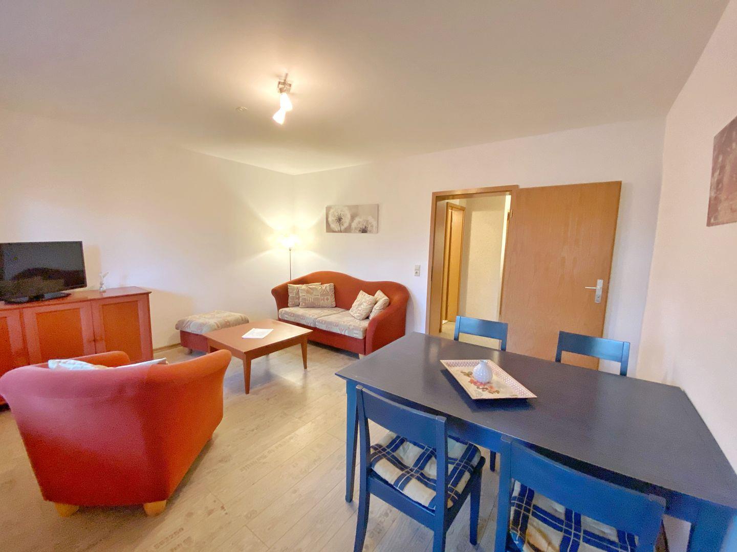 Die gemütliche Ferienwohnung hat eine Grundfläche von ca. 40 m² und unterteilt sich in einen Wohnraum mit Doppelbettcouch, einem Essbereich und Flachbild-TV, ein Schlafzimmer mit Doppelbett und Kleiderschrank, einen Flur mit Miniküche (Kühlschrank, 2 Kochplatten, Kaffeemaschine, Wasserkocher, Toaster) und ein Badzimmer mit Dusche und WC.