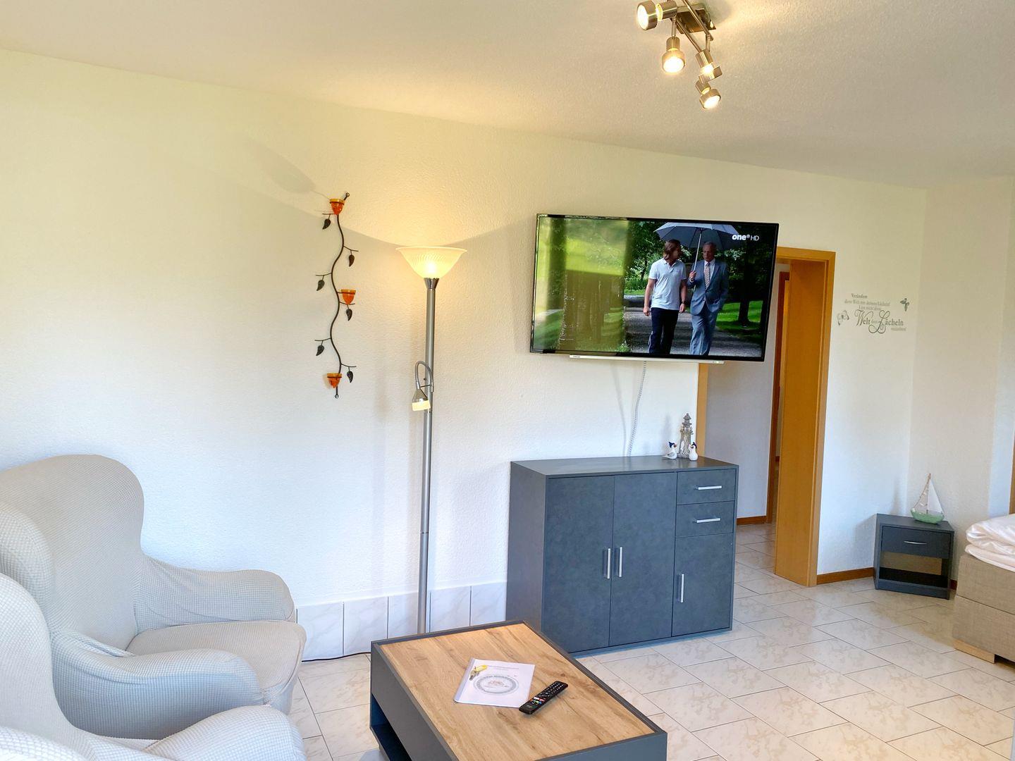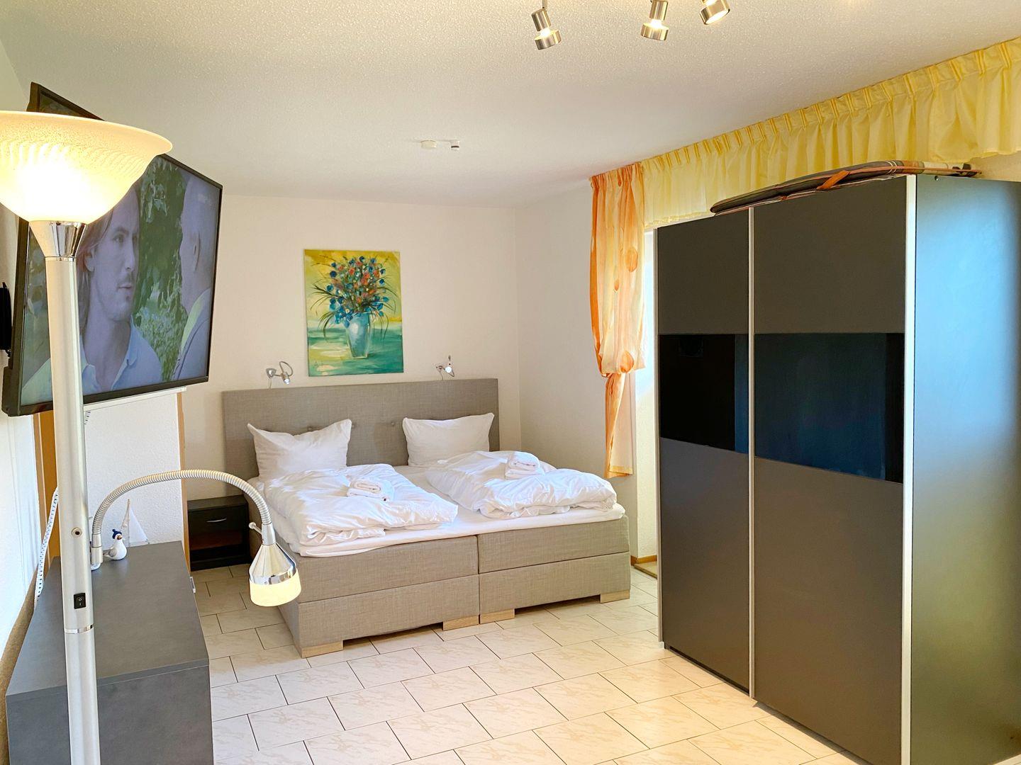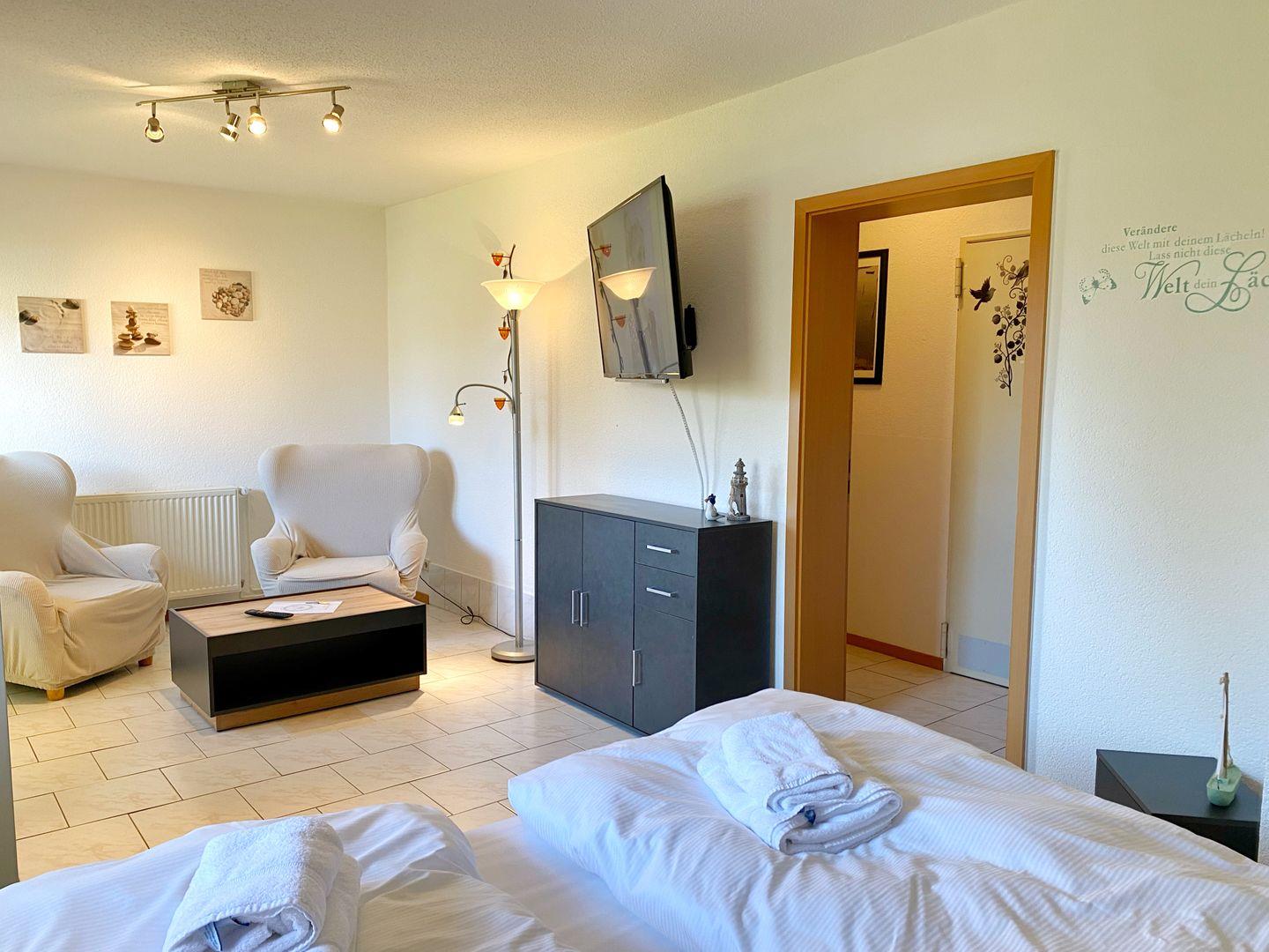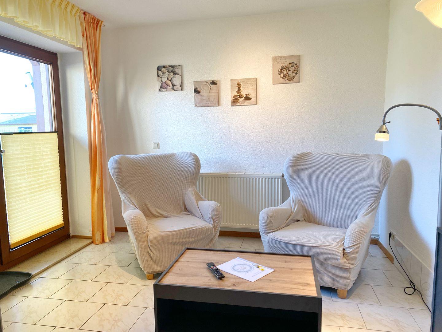 Sie verfügt über ein kombiniertes Wohn/Schlafzimmer mit Doppelbett, gemütlicher Sitzecke (2 Sessel und 1 Tisch), SAT-TV, DVD-Player, Radio und Kleiderschrank. Die separate Küche mit Esstisch ist ausgestattet mit Mikrowelle, Ceranfeld, Kühl-/Gefrierkombination, Toaster, Wasserkocher, Kaffeemaschine, diverses Geschirr und Geschirrspüler). Das Bad bietet eine Dusche und WC. In der Wohnung gibt es WLAN.