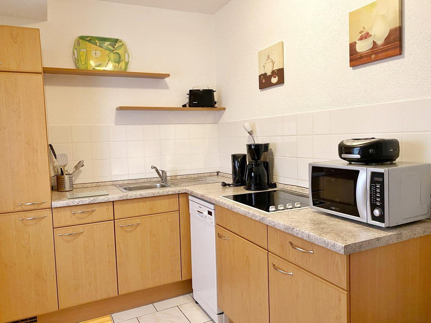 Alle Wohnungen verfügen über eine separate Küche (u.a. mit Mikrowelle, Cerankochfeld, Kühlschrank mit Gefrierfach und div. Geschirr) und Dusche/WC.