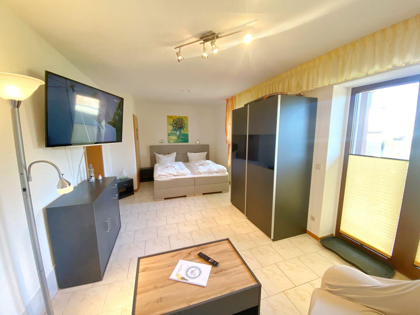 Die 1-Raum-Ferienwohnung (ca. 44 qm) befindet sich im Erdgeschoss und ist über die Terrasse erreichbar.