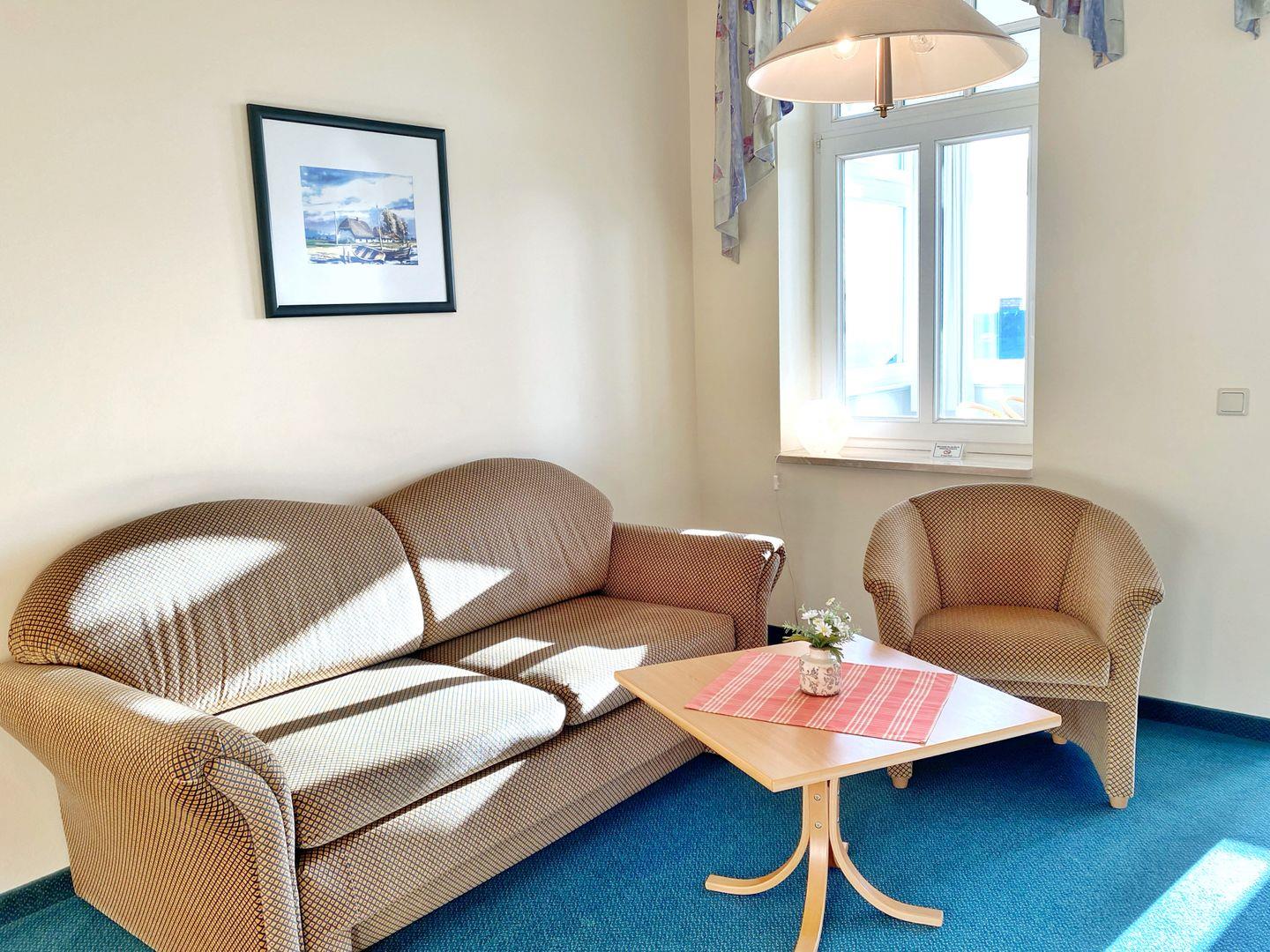 Das Wohnzimmer bietet eine Couch-Sitzecke und einen Schreibtisch.
