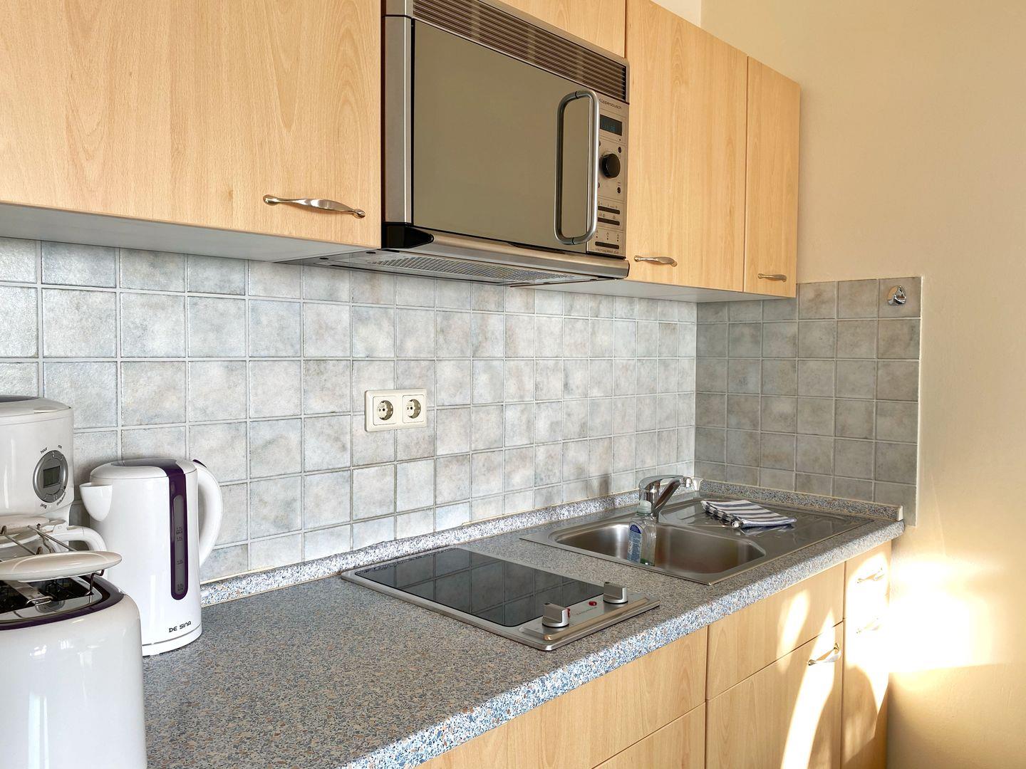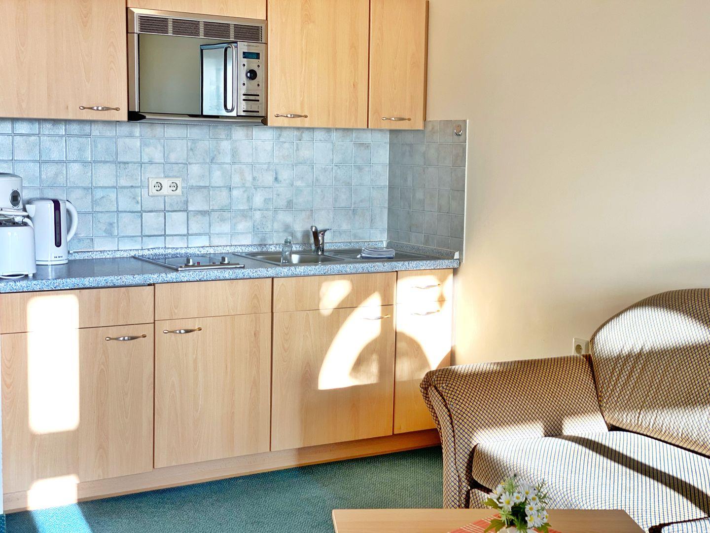 Die Küchenzeile mit Cerankochfeld, Mikrowelle, Kühlschrank mit Gefrierfach, Kaffeemaschine, Toaster und Wasserkocher ist im Wohnbereich integriert. In der Loggia befindet sich der Essplatz mit traumhaftem Blick.