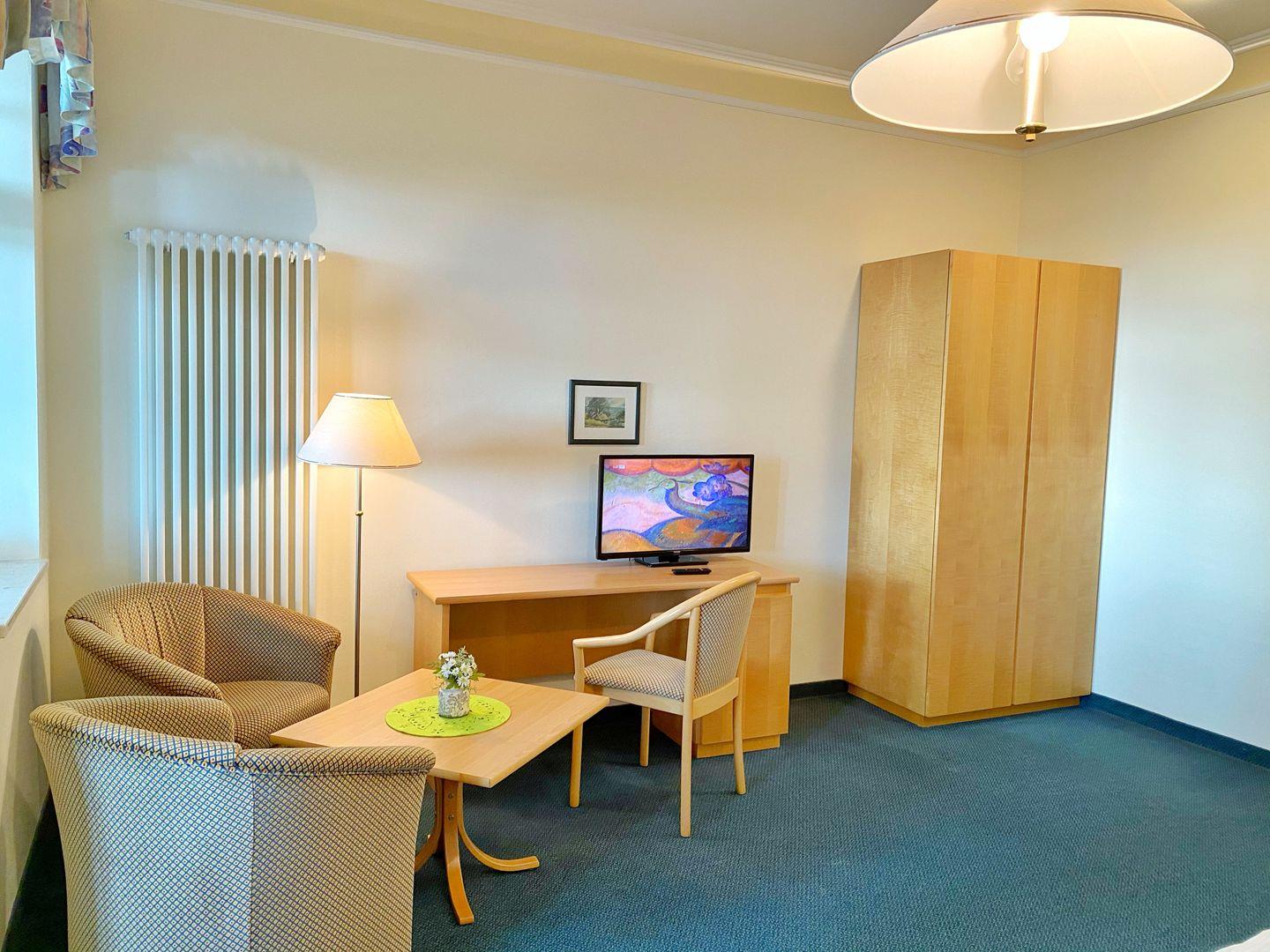 Im kombinierten Wohn-Schlafraum gibt es ein bequemes Doppelbett, eine Couch-Sitzecke und einen Schreibtisch.