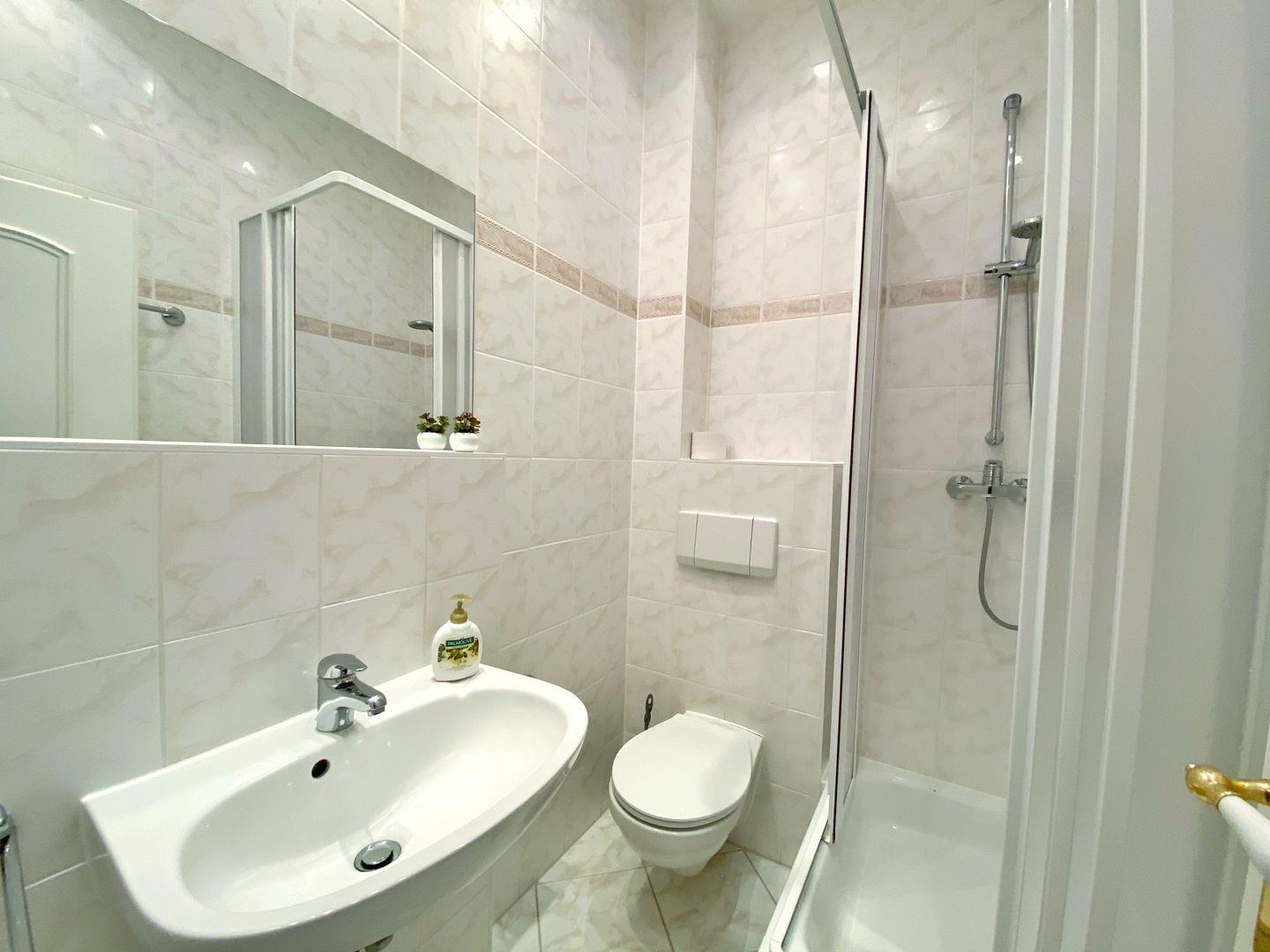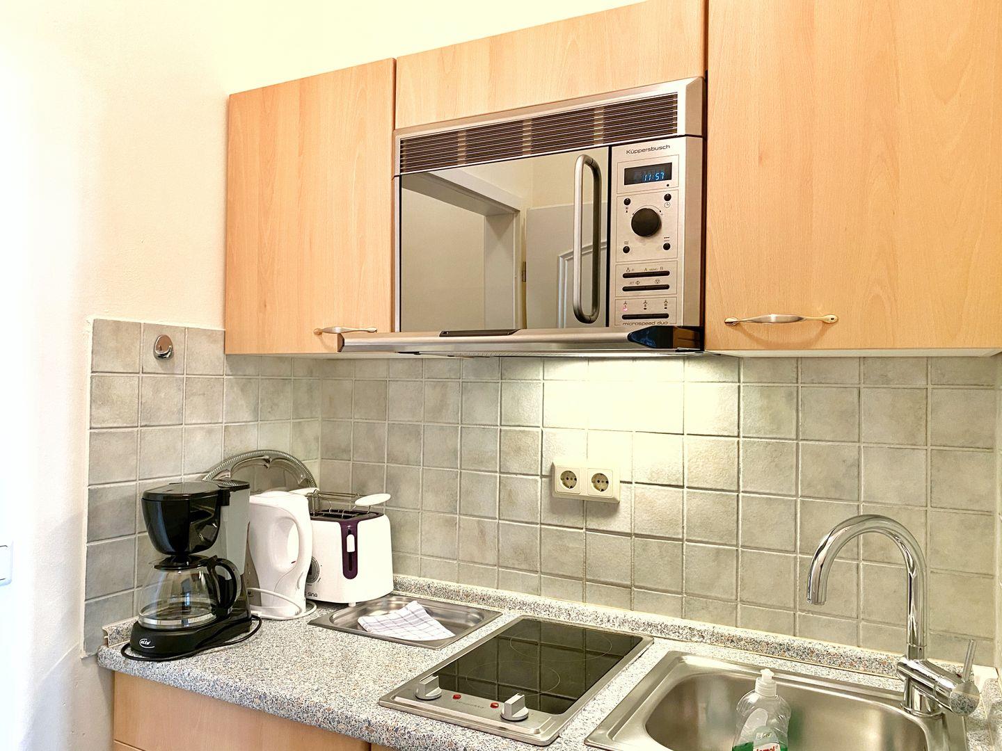 Im Eingangsbereich der kleinen Wohnung gibt es eine Küchenzeile mit Cerankochfeld, Mikrowelle, Kühlschrank mit Gefrierfach, Kaffeemaschine, Toaster und Wasserkocher. In der Loggia befindet sich der Essplatz mit herrlichem Ausblick. Das Bad bietet eine Dusche. WLAN ist vorhanden.