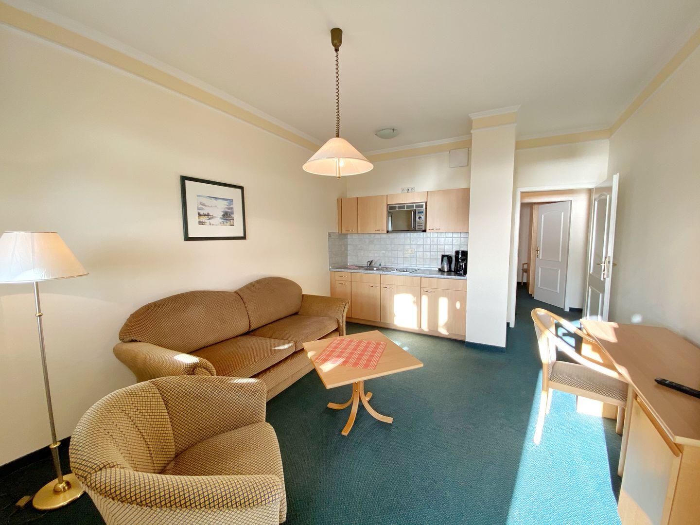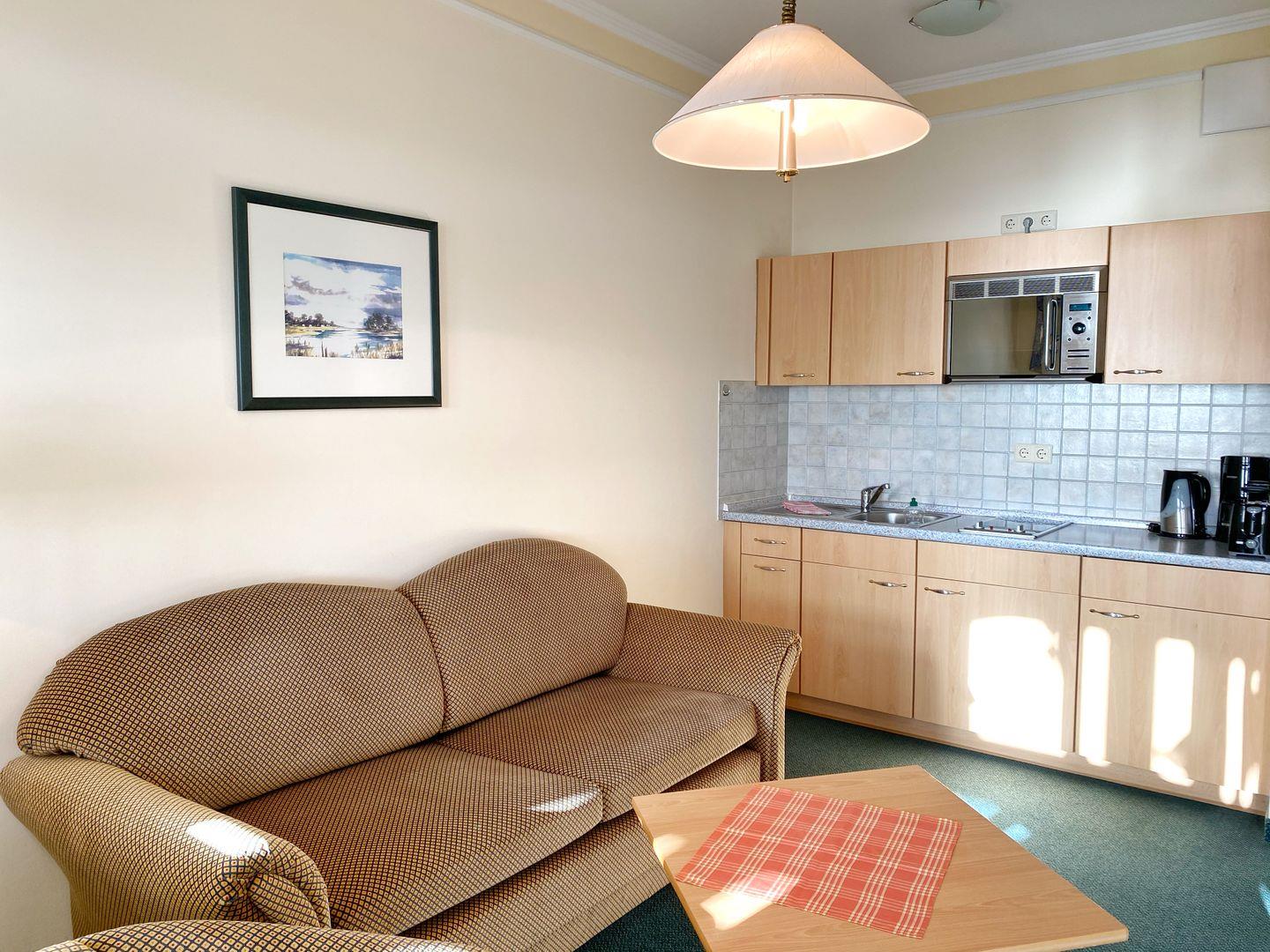Im Wohnzimmer können auf einer Schlafcouch zwei weitere Personen übernachten. Außerdem gibt es im Wohnbereich neben der Sitzecke einen Schreibtisch.