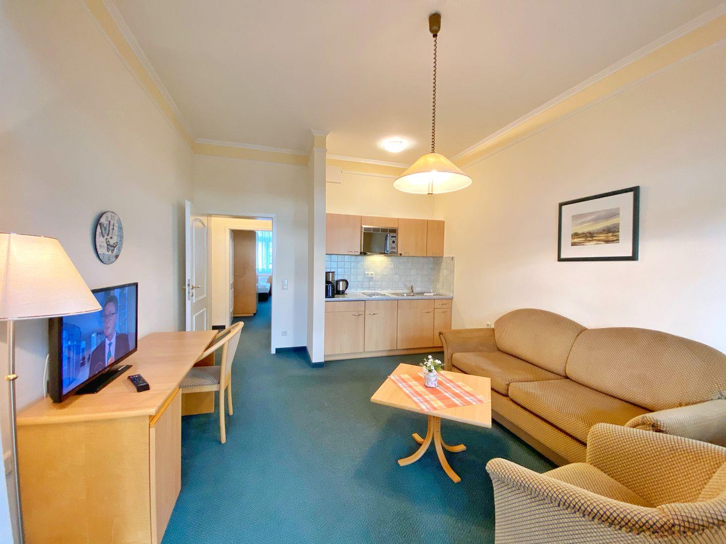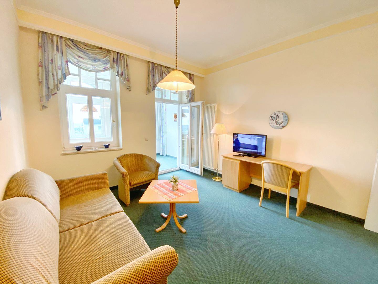 Das Wohnzimmer bietet eine Couch-Sitzecke und einen Schreibtisch.