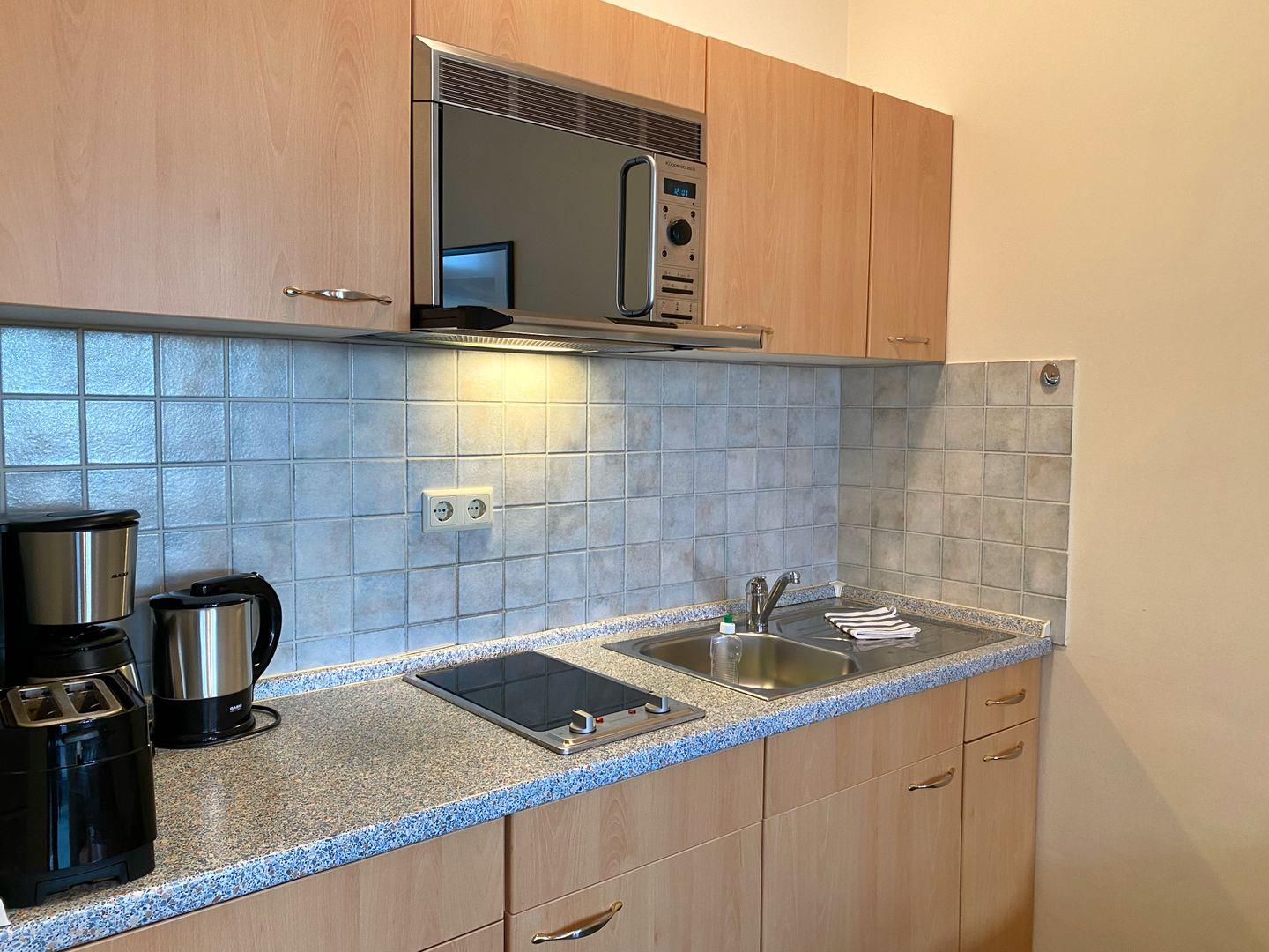 Die Küchenzeile mit Cerankochfeld, Mikrowelle, Kühlschrank mit Gefrierfach, Kaffeemaschine, Toaster und Wasserkocher ist im Wohnbereich integriert. In der Loggia befindet sich der Essplatz mit traumhaftem Blick.