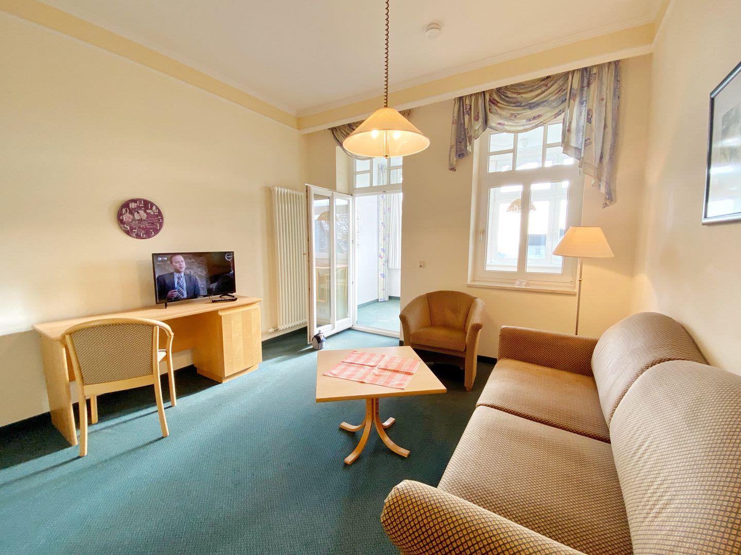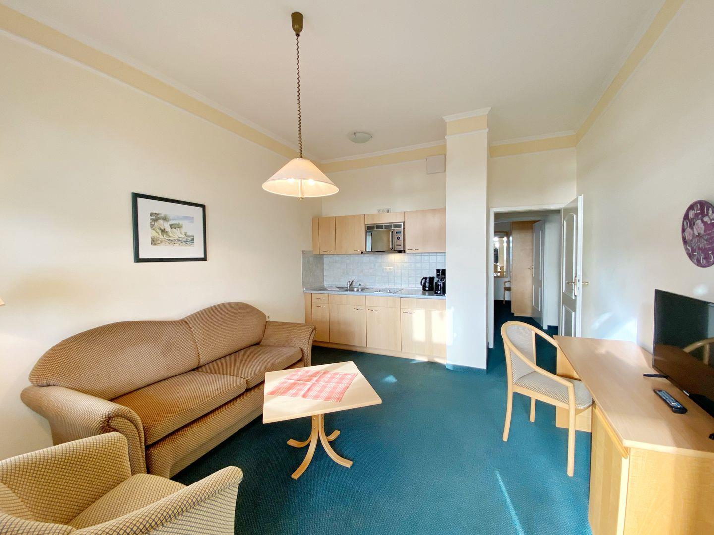 Im Wohnzimmer können auf einer Schlafcouch zwei weitere Personen übernachten. Außerdem gibt es im Wohnbereich neben der Sitzecke einen Schreibtisch.