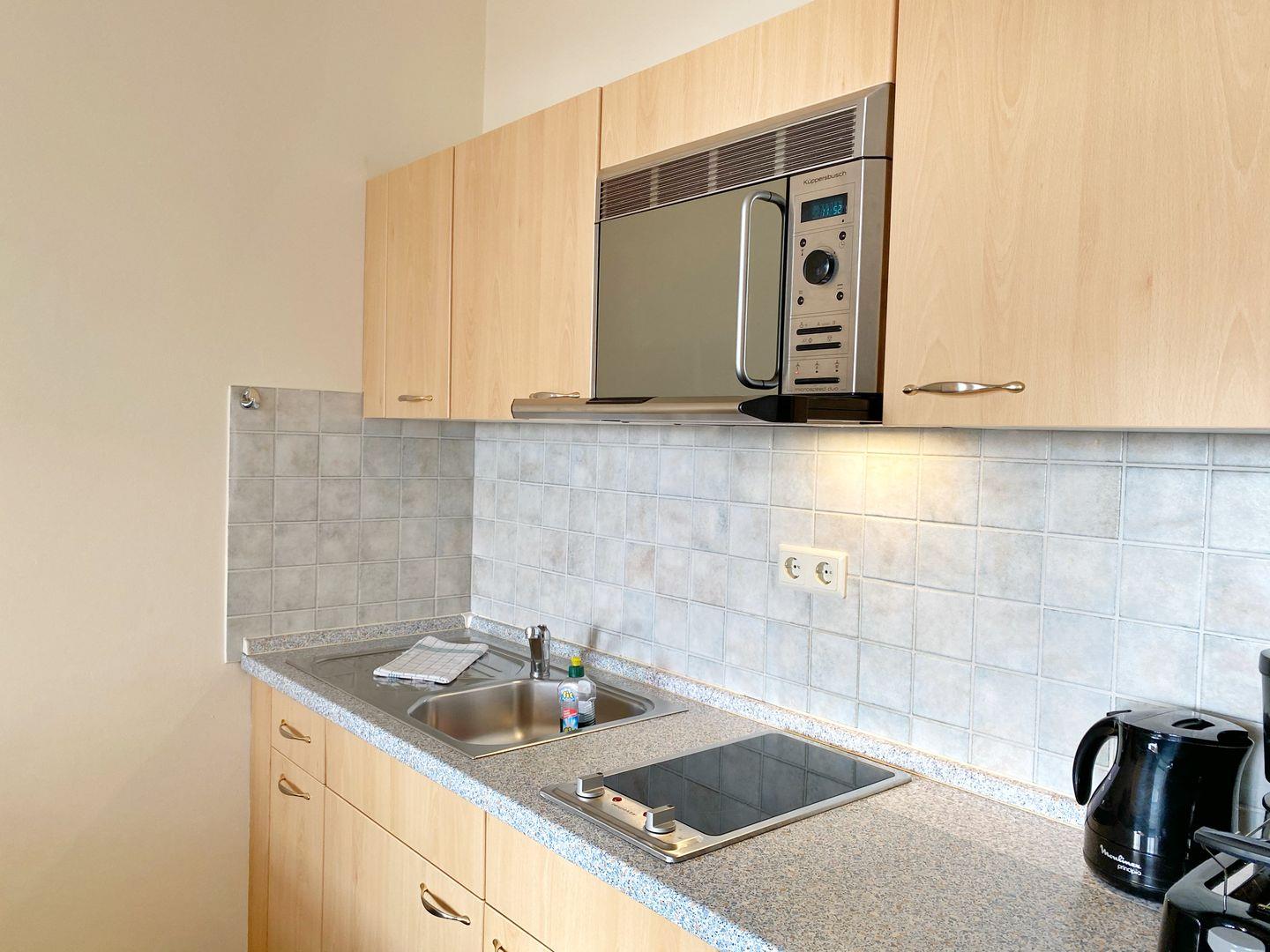 Die Küchenzeile mit Cerankochfeld, Mikrowelle, Kühlschrank mit Gefrierfach, Kaffeemaschine, Toaster und Wasserkocher ist im Wohnbereich integriert. In der Loggia befindet sich der Essplatz mit traumhaftem Blick.