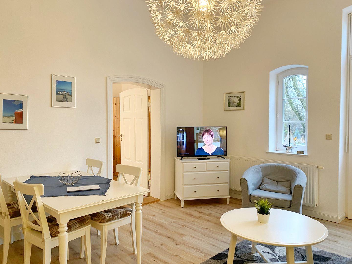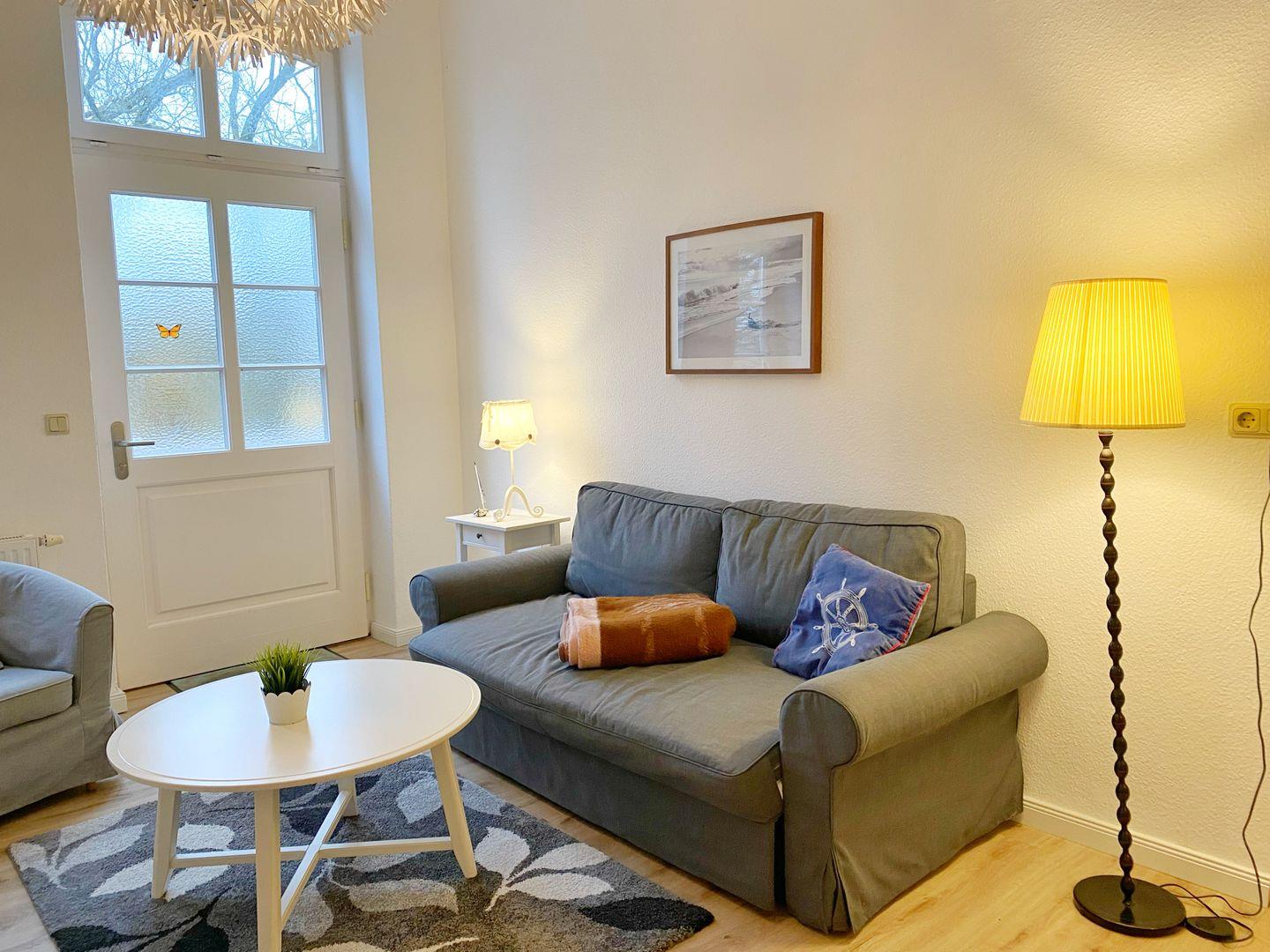 Sie befinden sich zeitgleich im gemütlich hellen Wohnbereich, der auch mit einer Holztür aus dem 19.Jahrhundert versehen ist die links zum separaten Schlafzimmer führt. Im Wohnbereich finden Sie folgendes vor :
