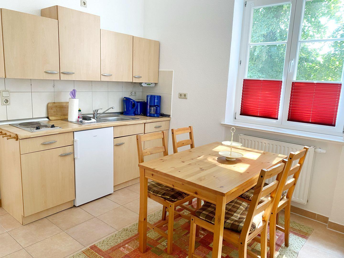 Durch die Wohnungseingangstür aus der Mitte des 19. Jahrhunderts, wunderschön und originalgetreu restauriert, gelangen Sie in die geräumige helle Küche in der sich ausreichend Platz und Sitzmöglichkeiten befinden. Eine Besonderheit der gesamten Wohnung sind hier die über drei Meter hohen Decken, die so charakteristisch für viele Gutshäuser sind.