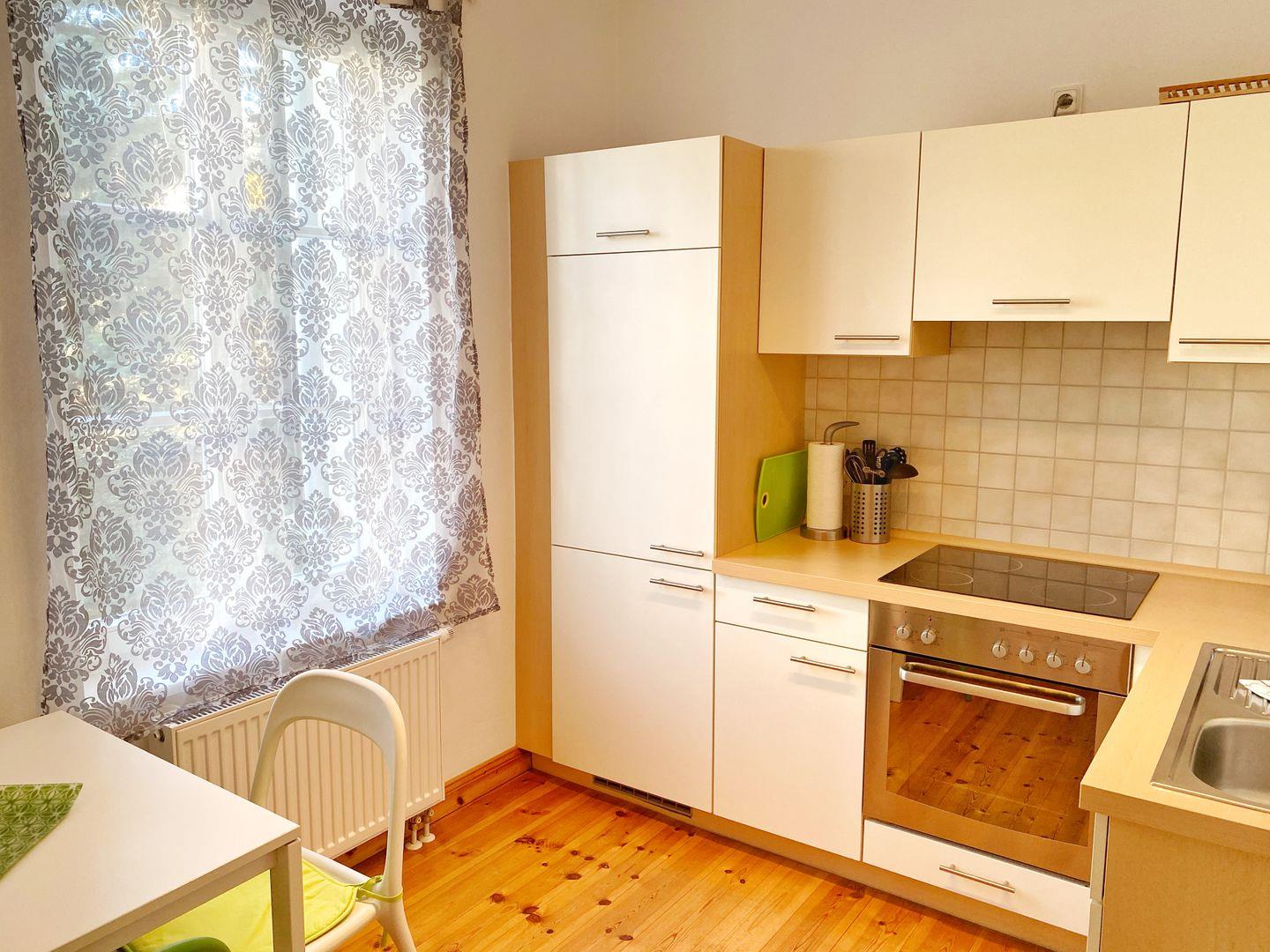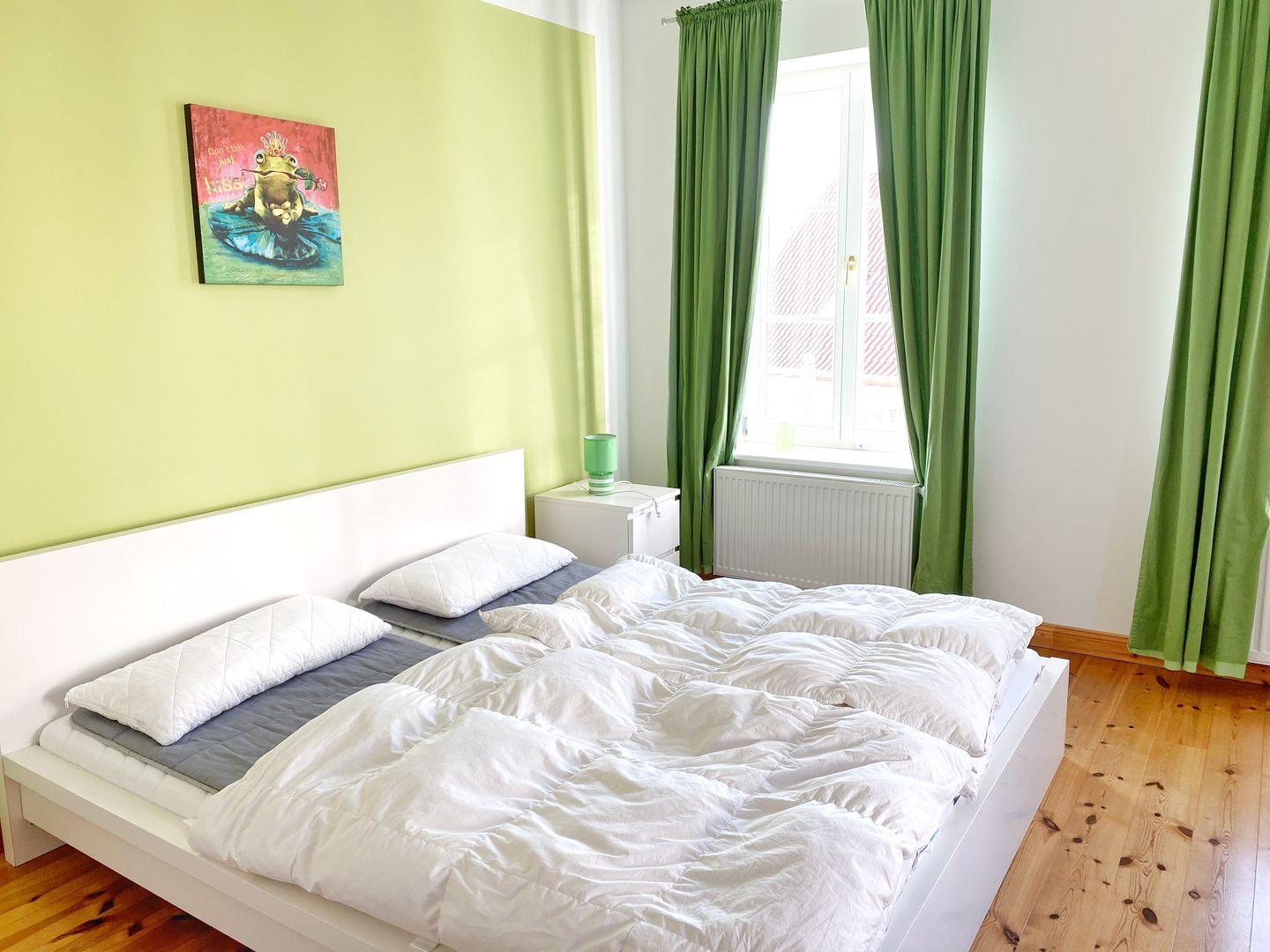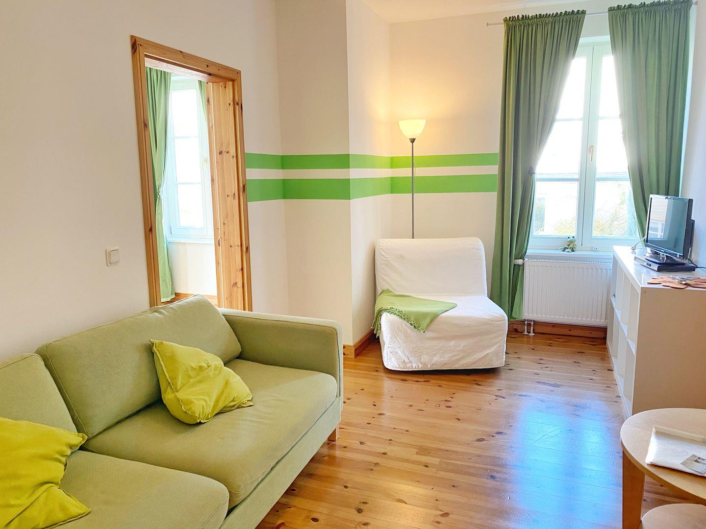 Ein kräftiger Grünton kombiniert mit weissen Möbeln prägt das Bild der Ferienwohnung im 1. Obergeschoss mit Blick auf die Altstadt.
