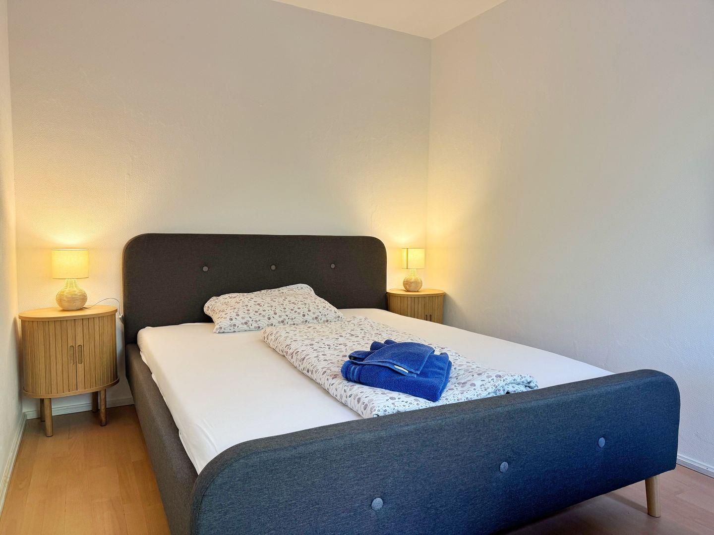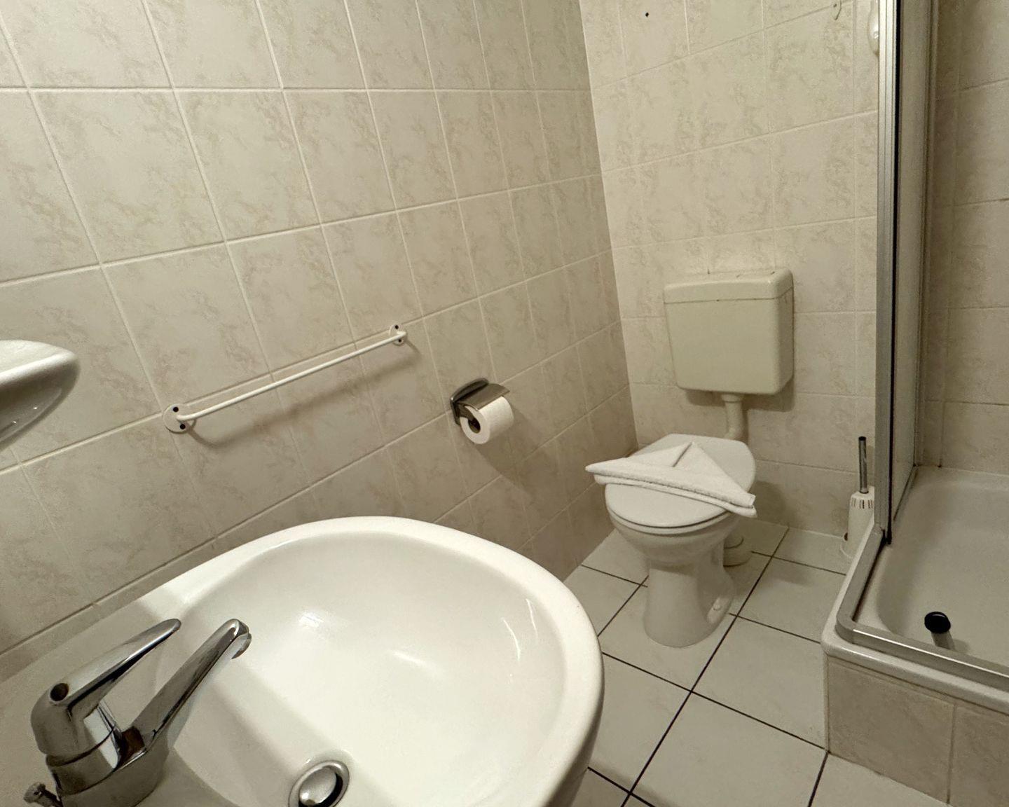 Das Doppelzimmer einfachen Standards befindet sich straßenseitig im Erdgeschoss und ist etwa ca. 25 m² groß. Es gliedert sich in einen kleinen Flur mit Kleiderschrank, ein Badezimmer mit Dusche und WC und einen Schlafraum mit 2 einem Doppelbett, einem Esstisch mit 2 Stühlen, einem kleinen Kühlschrank und einem Flachbildfernseher. Das Zimmer hat einen kostenfreien Internetzugang und einen PKW-Stellplatz.