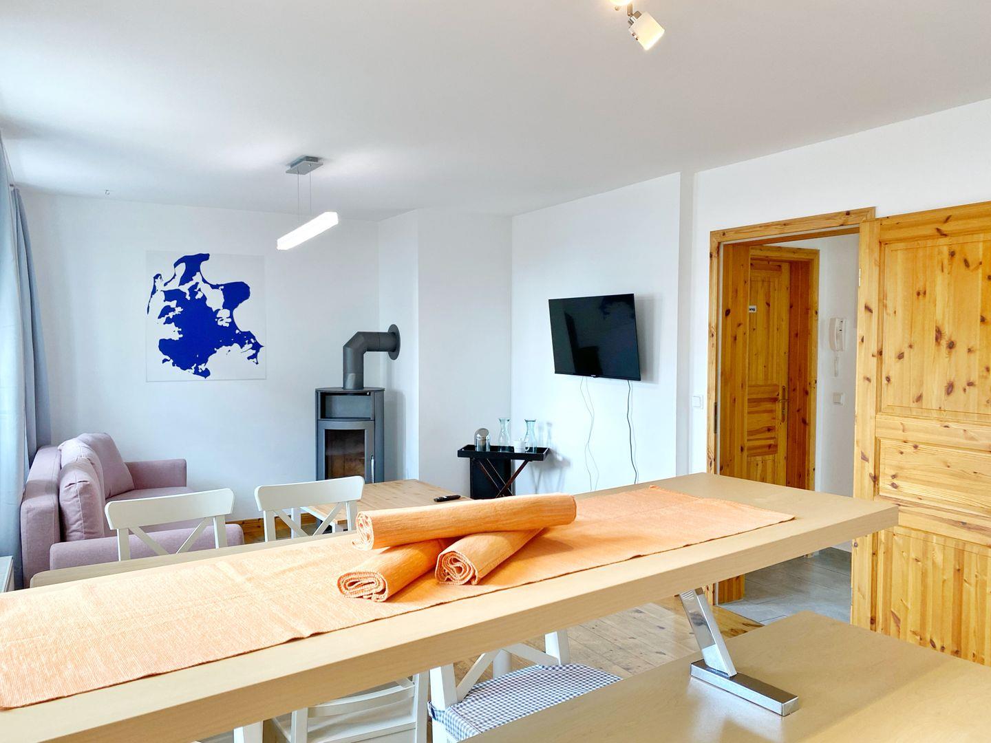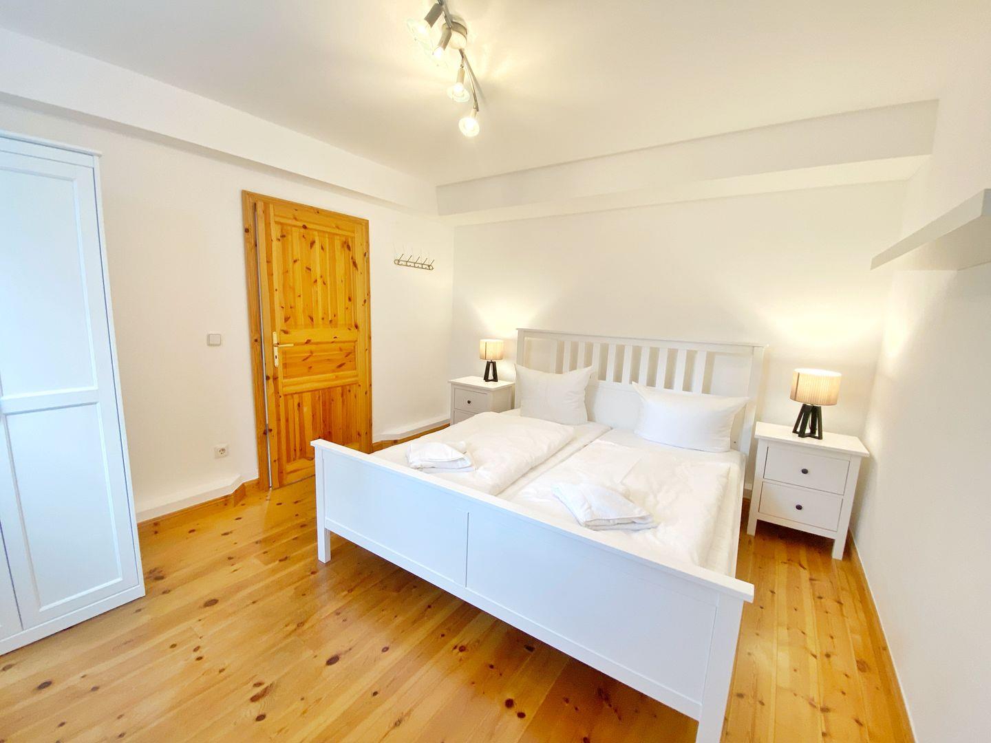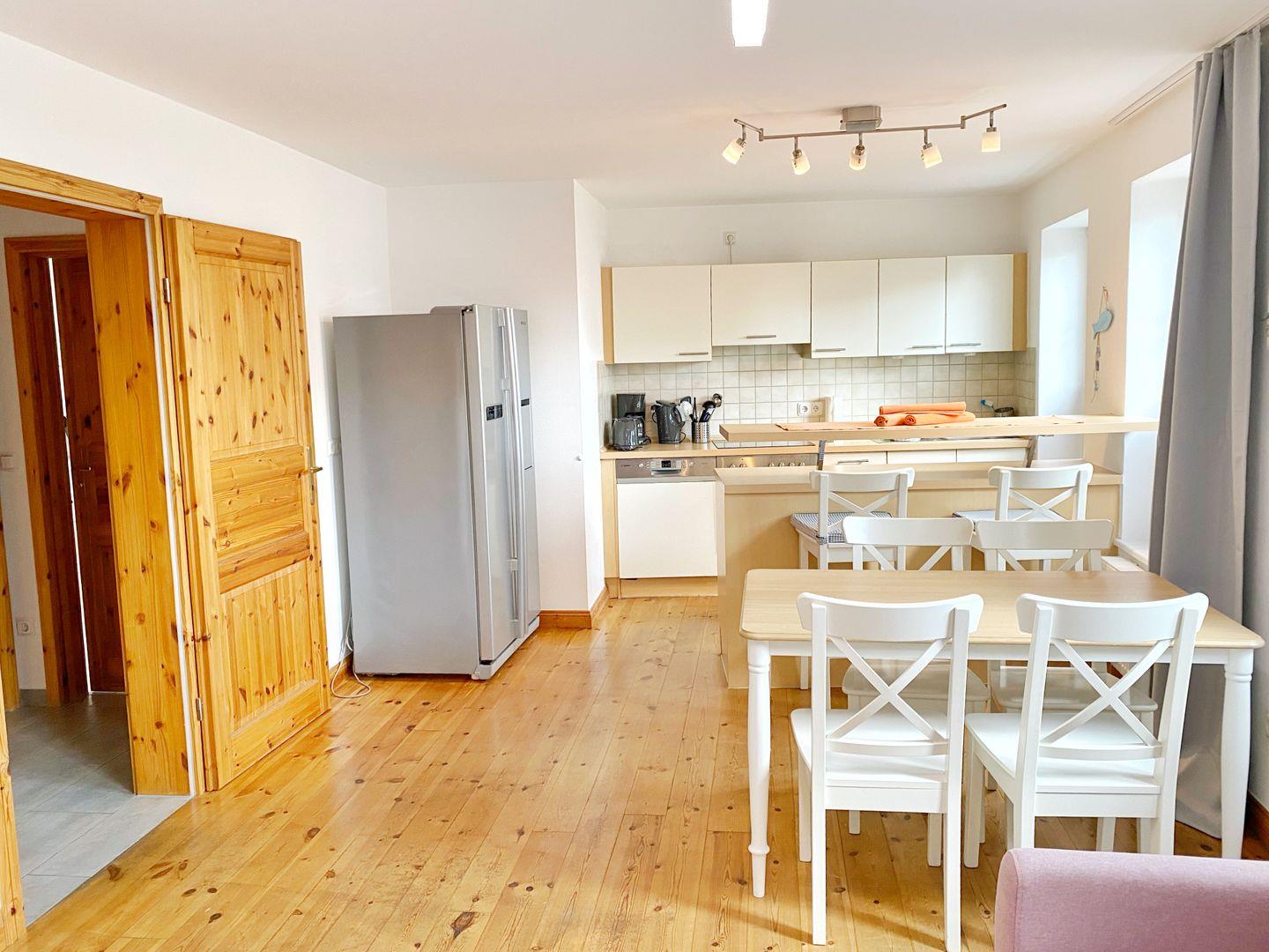 Es gibt ein Schlafzimmer mit Doppelbett und Kleiderschrank. Das Wohnzimmer mit Flat-TV verfügt über eine gemütliche Couch, die auf Wunsch zur Schlafcouch ausgezogen werden kann. Speisen Sie am Esstisch oder auch am Tresen, welcher die offene Küche vom Wohnbereich optisch trennt.