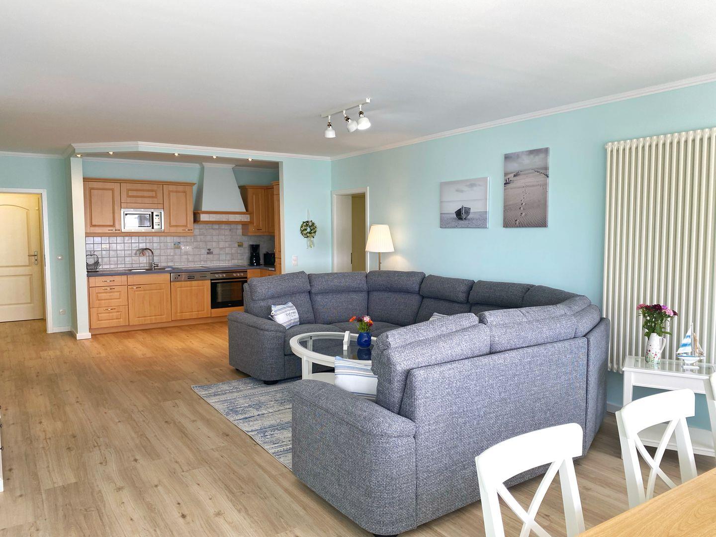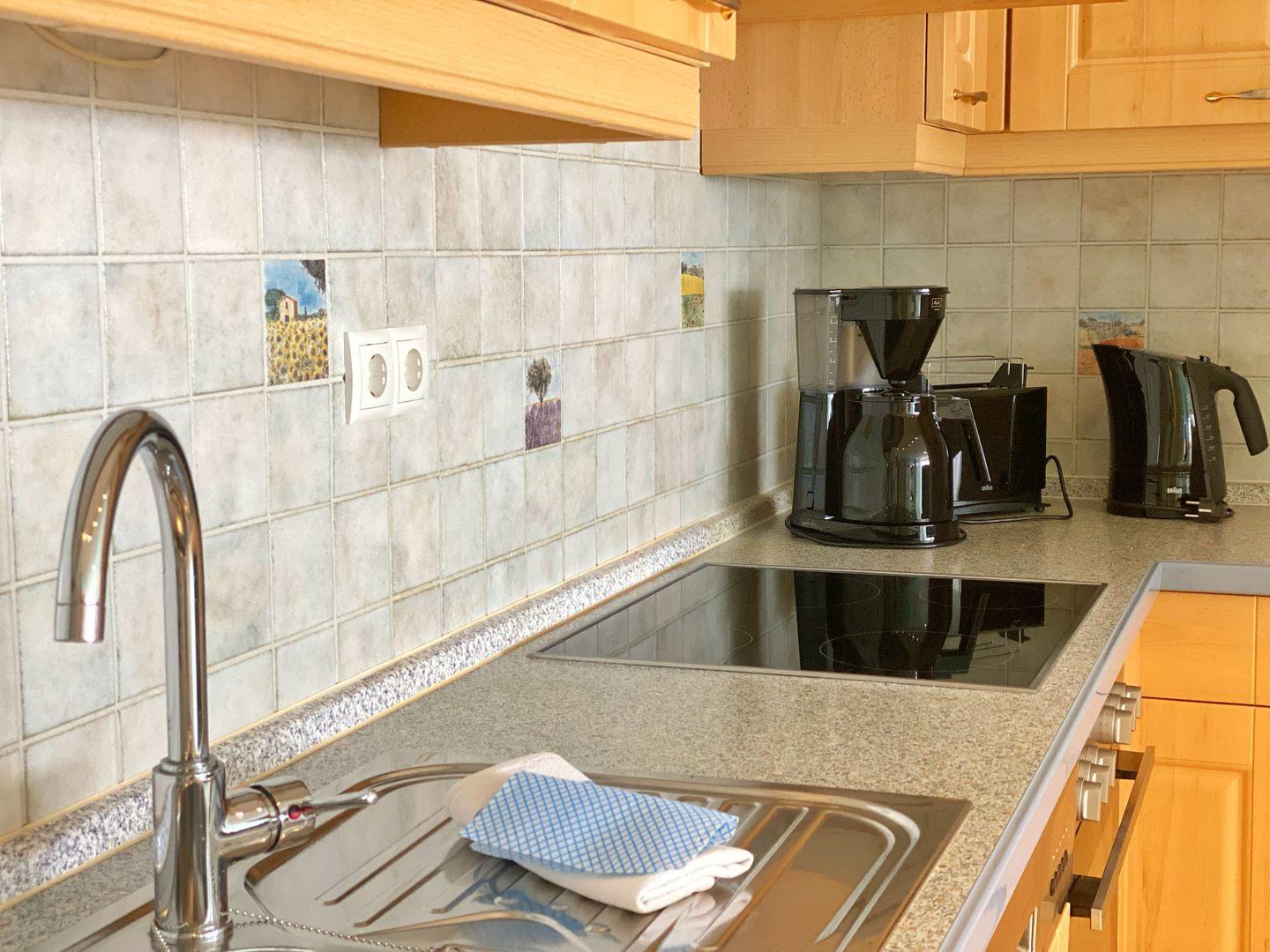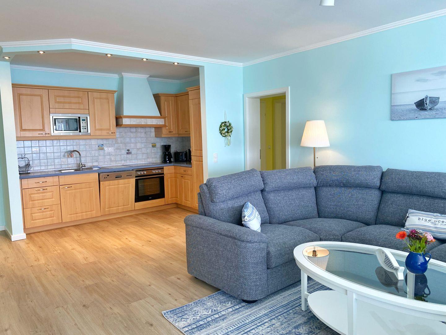 Die komplett ausgestattete Einbauküche ist in den Wohnbereich integriert. Sie bietet einen Geschirrspüler, Mikrowelle, Backofen, Ceranfeld, Kühlschrank und natürlich Kaffeemaschine, Wasserkocher und Toaster.