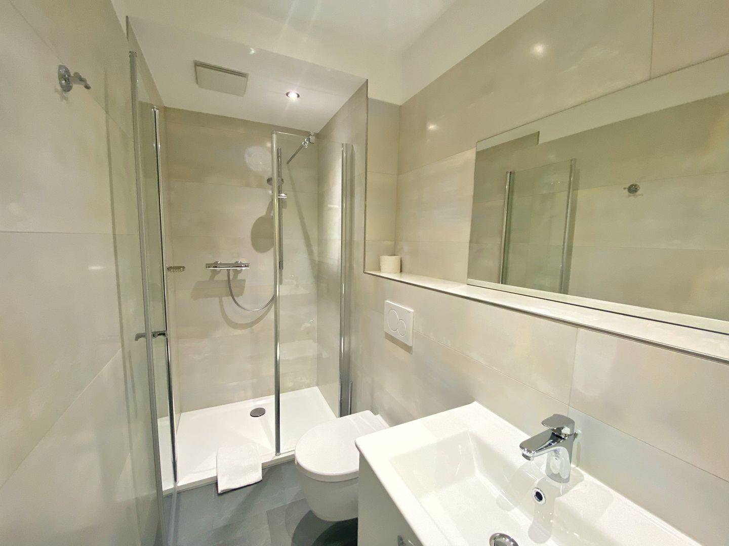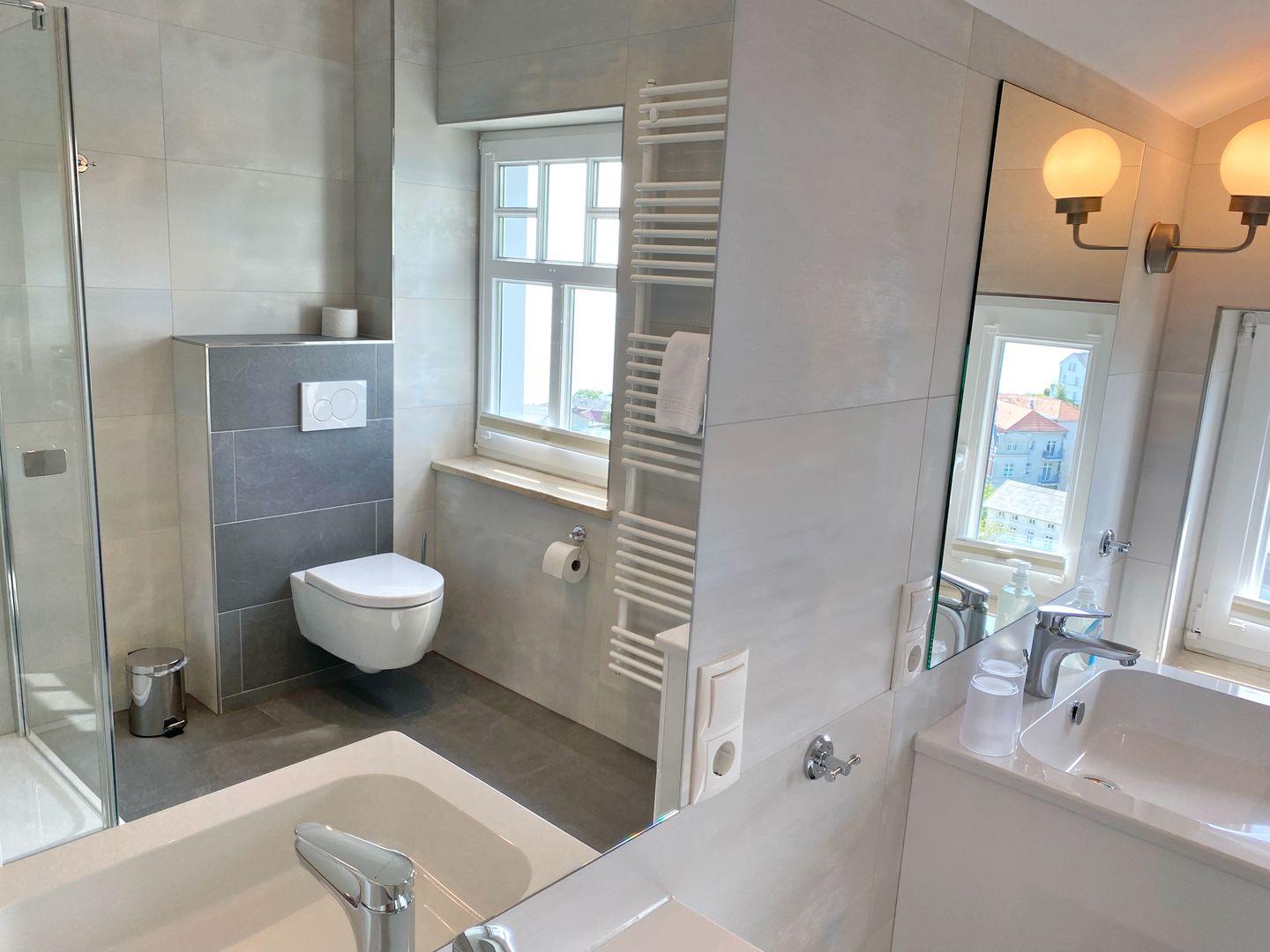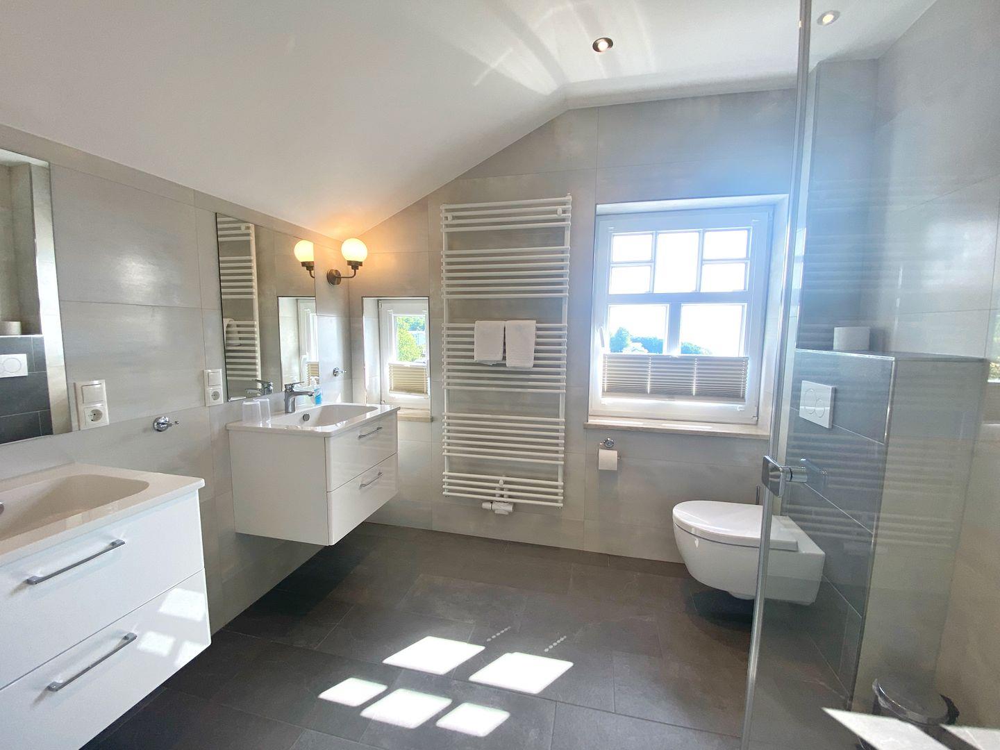 Außerdem verfügt die großzügige, helle Wohnung über 2 Bäder. Das große Bad hat zwei Waschtische, eine ebenerdige Glasdusche und WC. Das kleinere Bad hat einen Waschtisch und ebenfalls eine ebenerdige Glasdusche und WC.