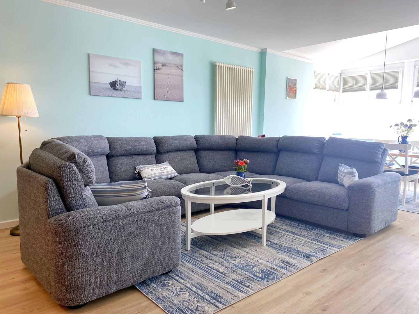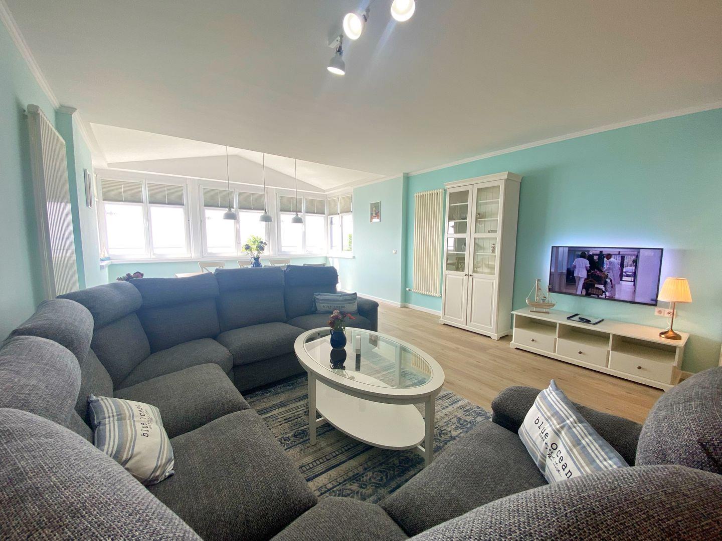 Im Wohnbereich gibt es eine gemütliche große Halbrund-Couch, die vor dem großen Flachbild-TV zum entspannen einlädt. In der verglasten Loggia steht der große Esstsich mit Traum-Ausblick.