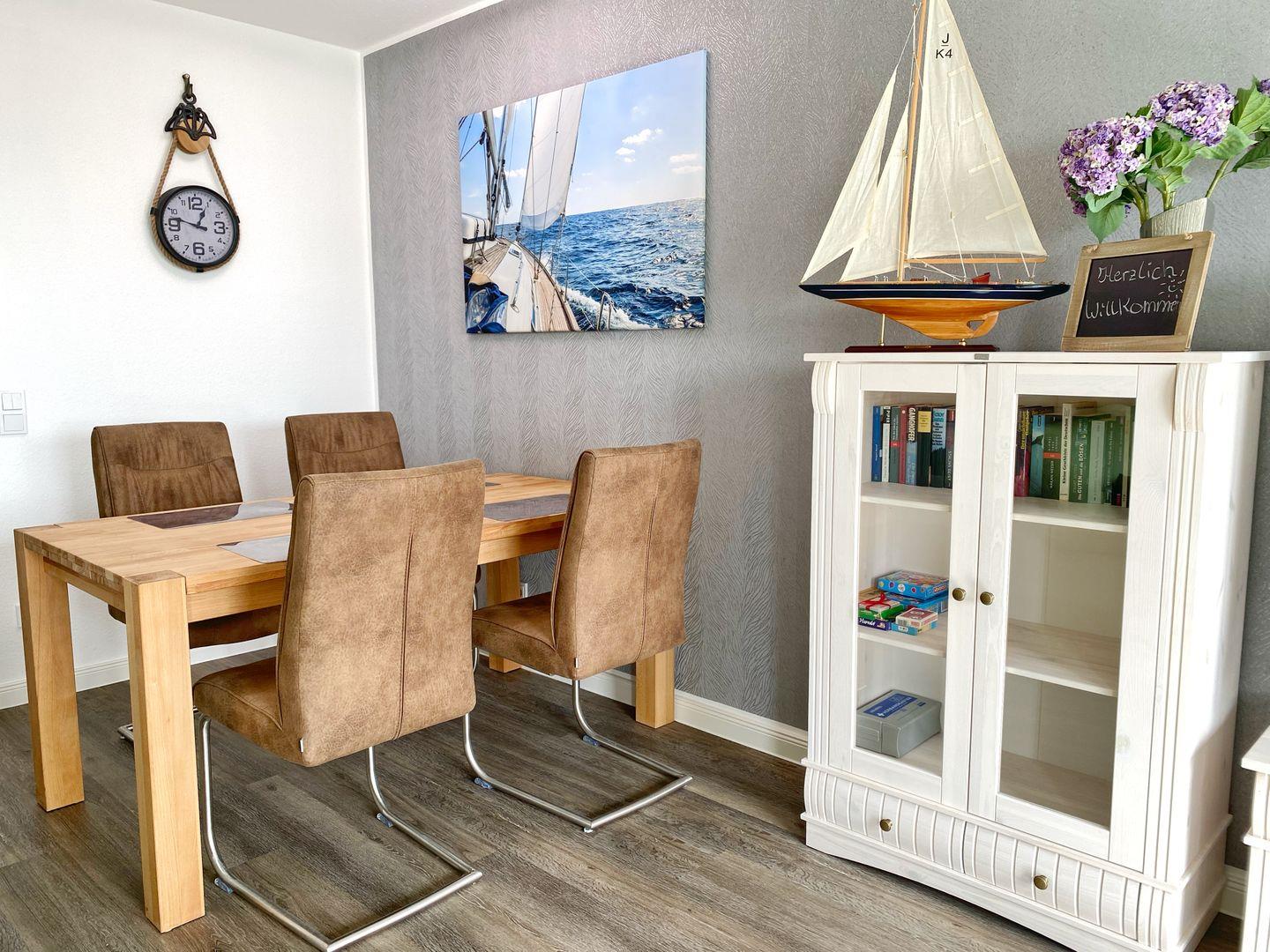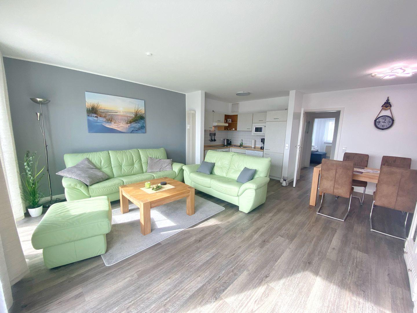 Die offene, komplette Küchenzeile ist geschickt im Wohnbereich integriert und verfügt über eine komplette Ausstattung inkl. Geschirrspüler und Mikrowelle.