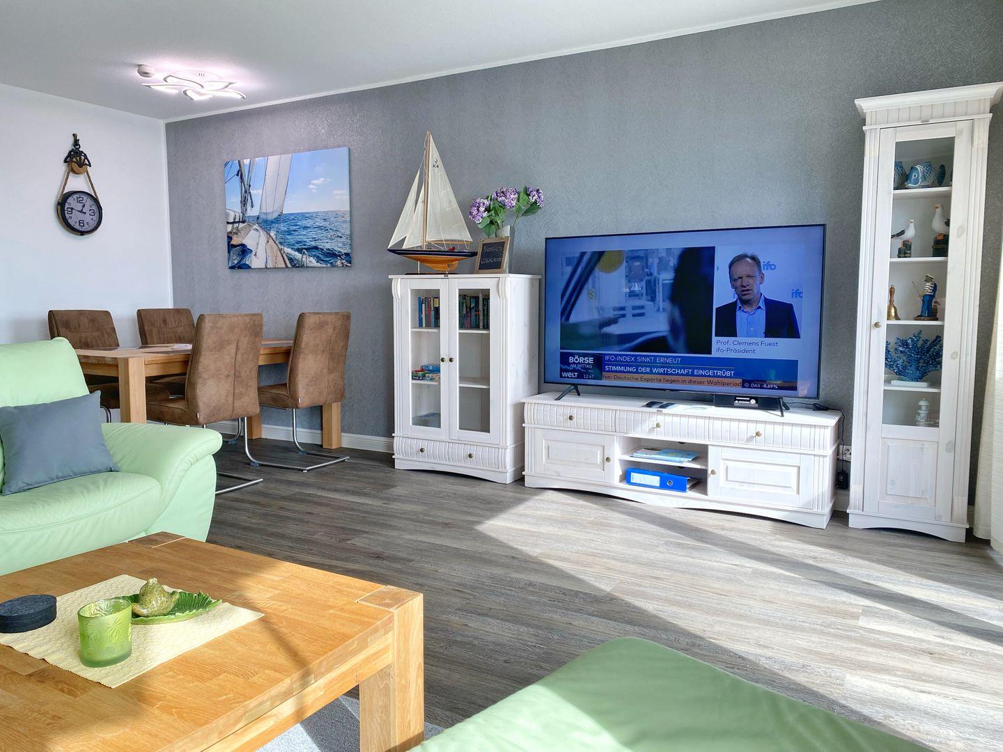 Im Wohnbereich können 2 Reisebetten aufgestellt werden, um Schlafmöglichkeiten für eine 3. und 4. Person zu schaffen. Es gibt dort einen Flat-TV, einen DVD-Player sowie einen Radio-CD-Player.