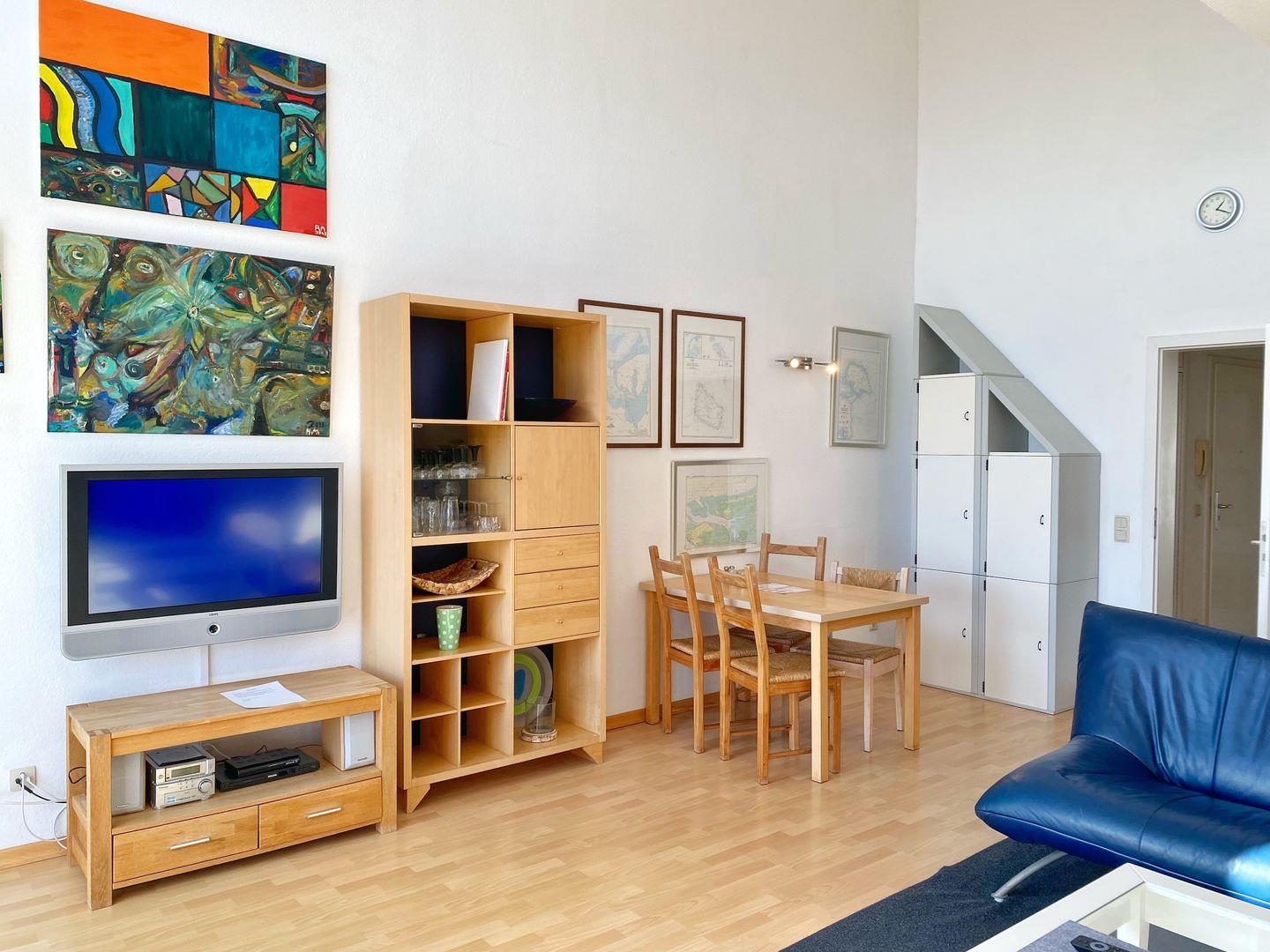 Neben einer gemütlichen Couchecke gibt es einen Esstisch, Flat-TV und DVD-Player. WLAN ist vorhanden.
