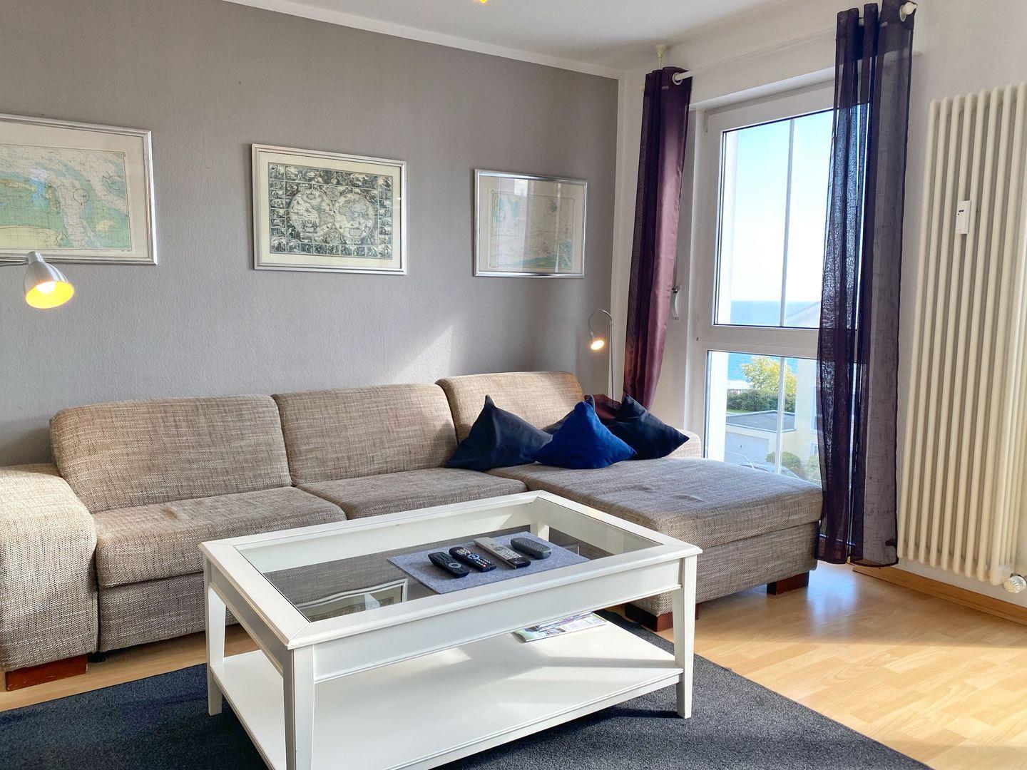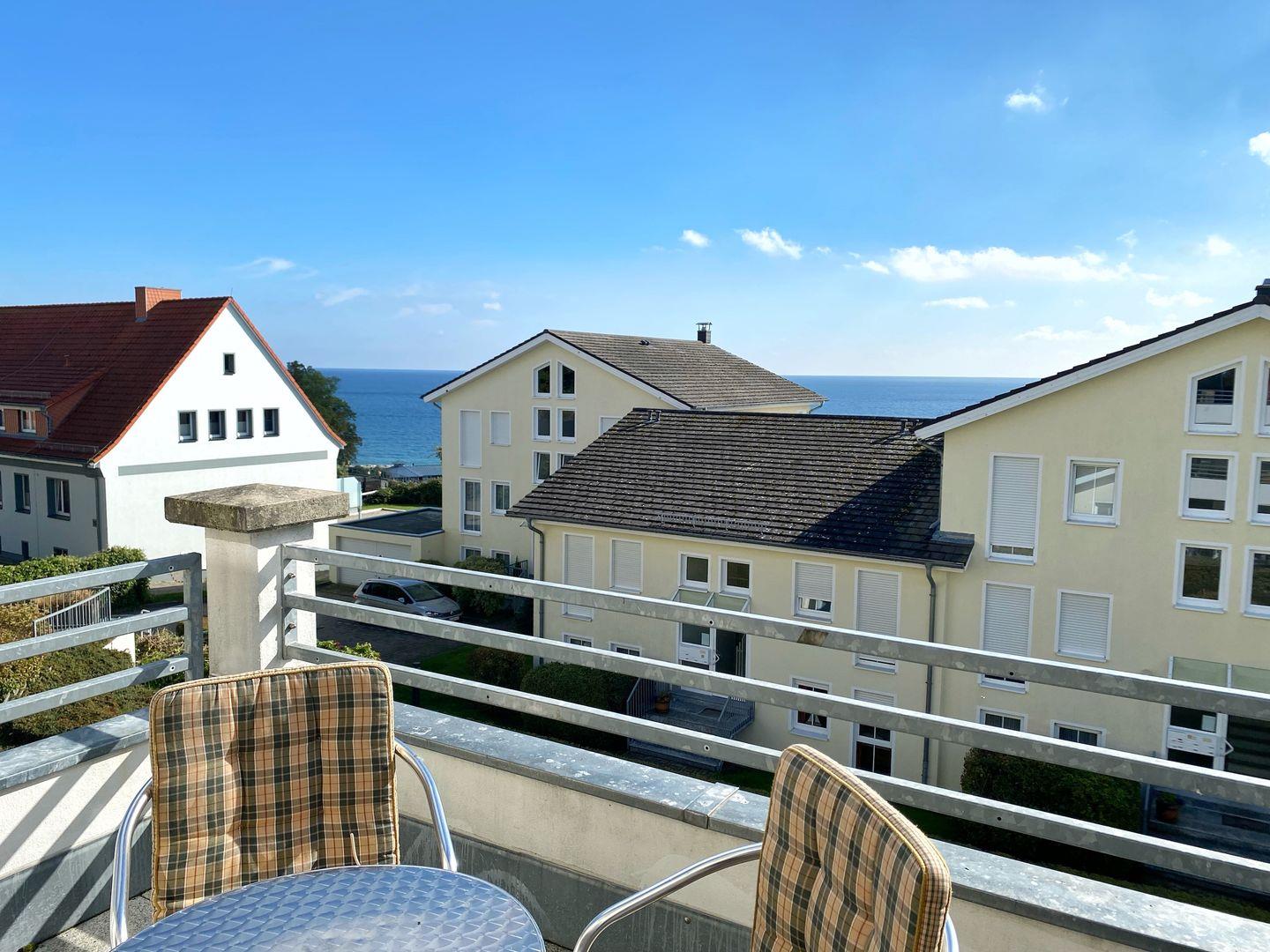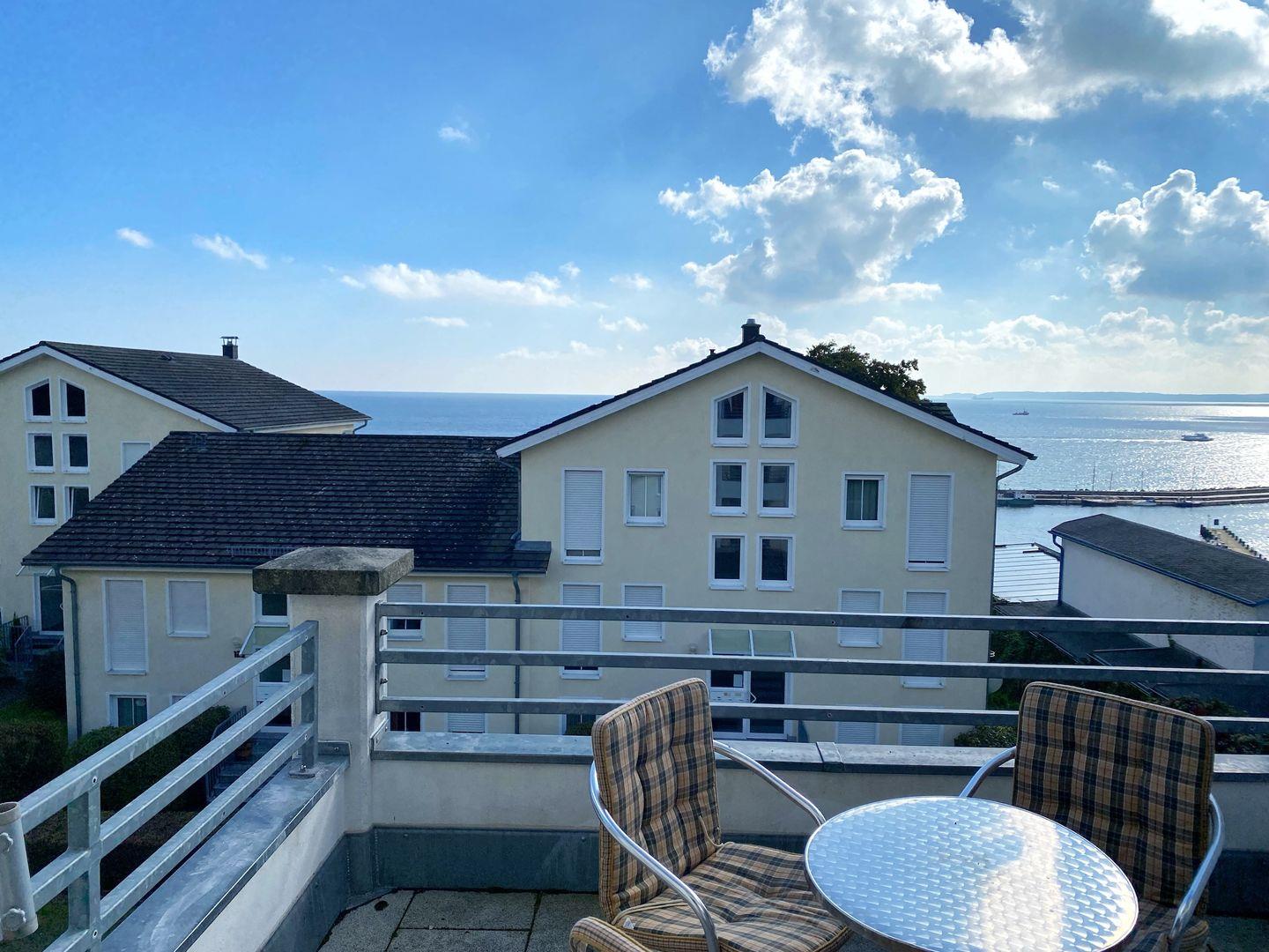 Vom dem Wohnbereich vorgelagerten, möblierten Süd-Balkon haben Sie einen schönen Blick auf die Mole und die Ostsee.