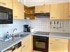 Die offene Küchenzeile ist geschickt im Wohnbereich integriert und verfügt über eine komplette Ausstattung inkl. Geschirrspüler und Mikrowelle.
