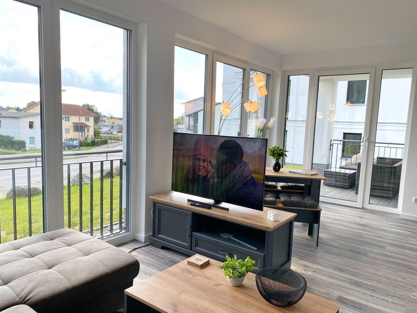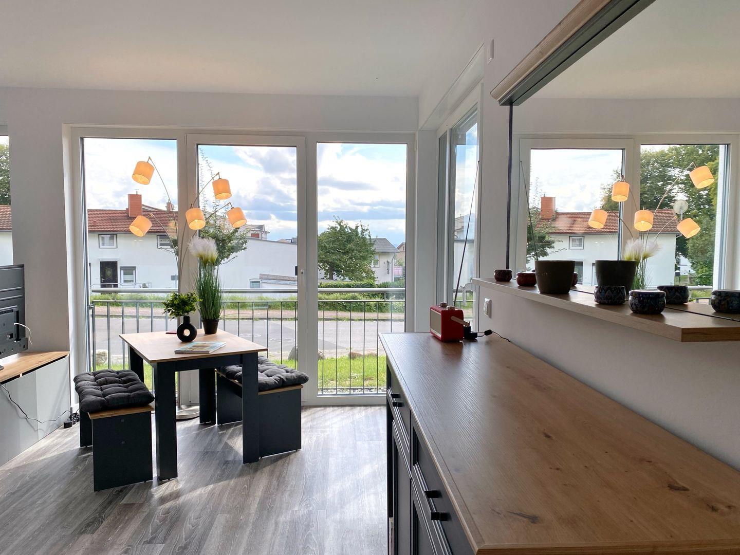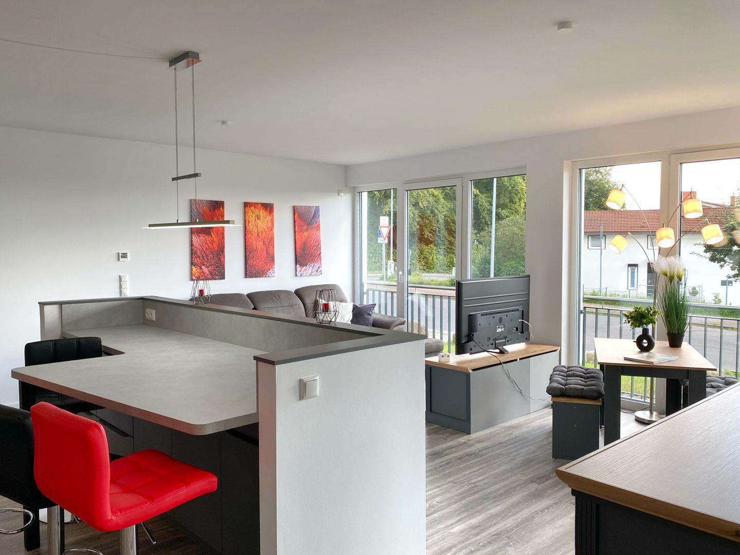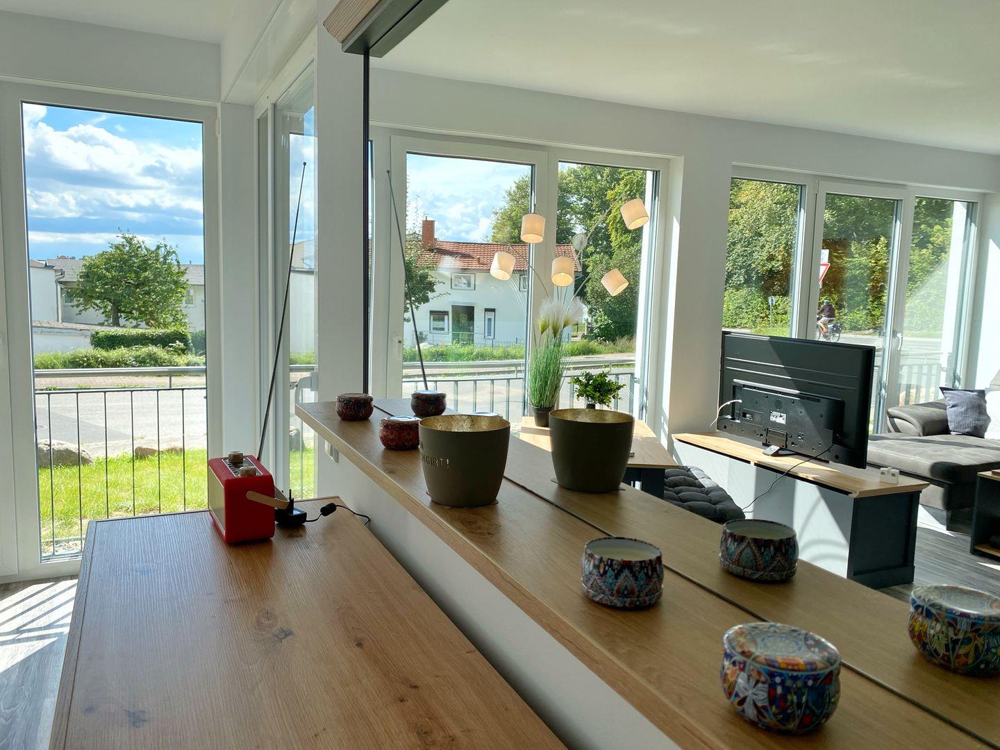 Im Wohnbereich gibt es neben einem bequemen Sofa, Flachbild-TV und Radio einen Esstisch mit Sitzbänken. Ein weiterer Essplatz befindet sich am Tresen zwischen Küche und Wohnbereich mit 4 Barhockern. WLAN ist in der Wohnung vorhanden.