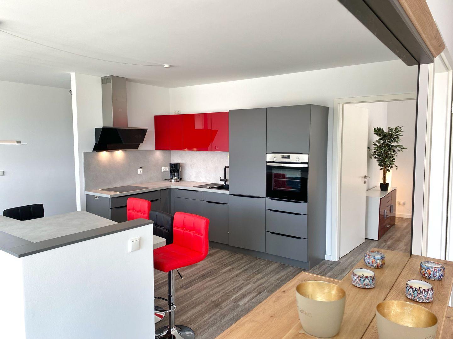 In das Wohn-Esszimmer ist eine moderne Einbauküche integriert. Die Küche ist komplett ausgestattet mit Geschirrspüler, Ceran-Herd, Hoch-Backofen, Mikrowelle, Kühlschrank mit Gefriermöglichkeit und weiteren Selbstverständlichkeiten wie Kaffeemaschine, Wasserkocher, Toaster, Eierkocher, Milchaufschäumer und einer Küchenmaschine.