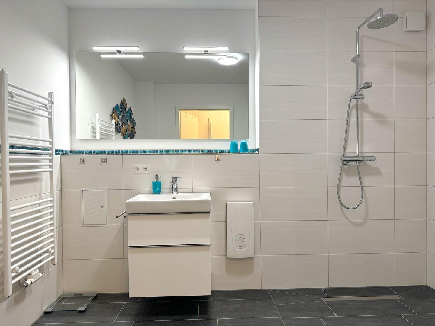 Im Bad gibt es eine ebenerdige Dusche. Die Wohnung ist hell, freundlich und mit modernen Möbeln eingerichtet.