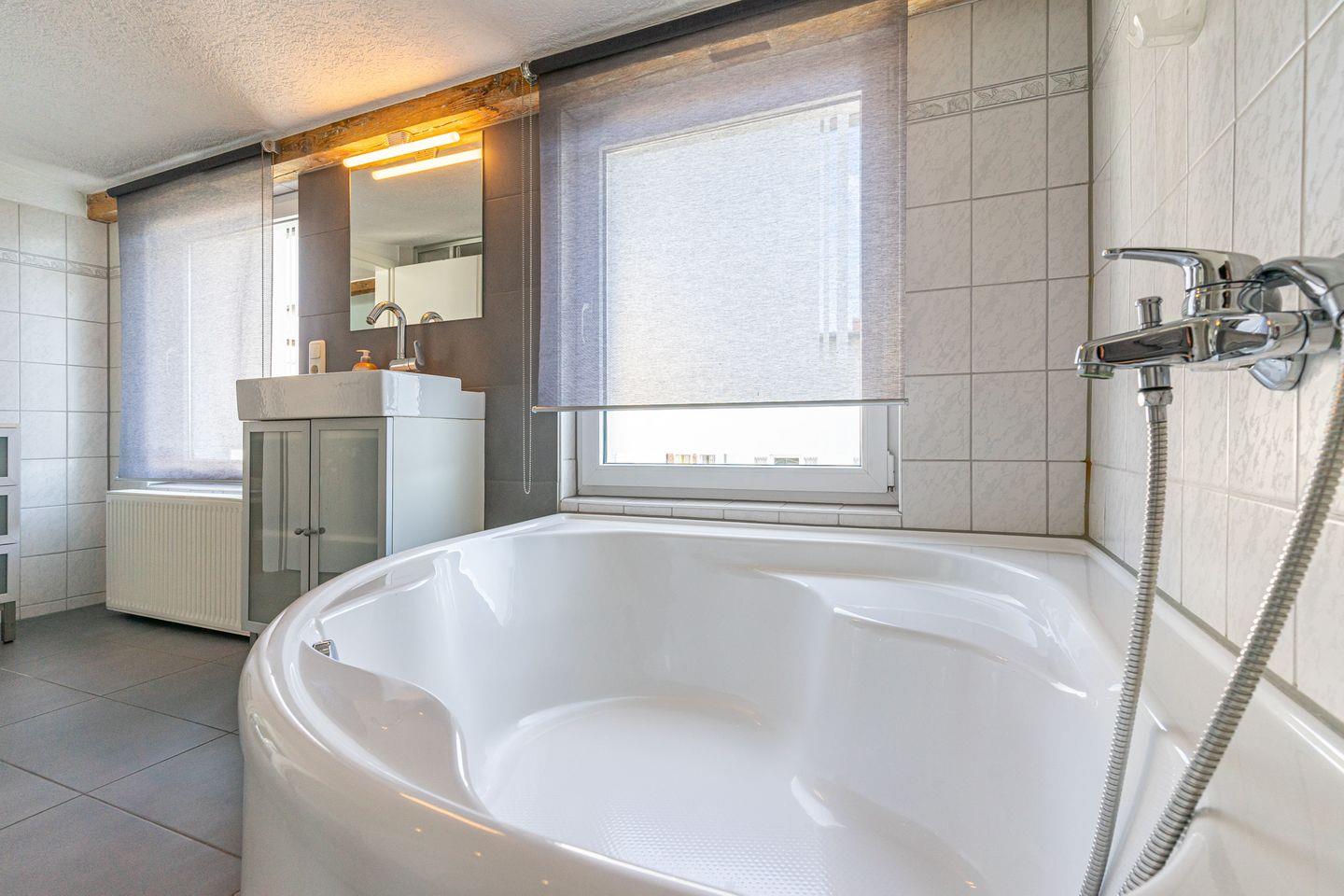 Im großzügigen, hellen Badezimmer mit Fenstern gibt es eine große Eck-Badewanne, eine separate Dusche sowie WC und Waschtisch.