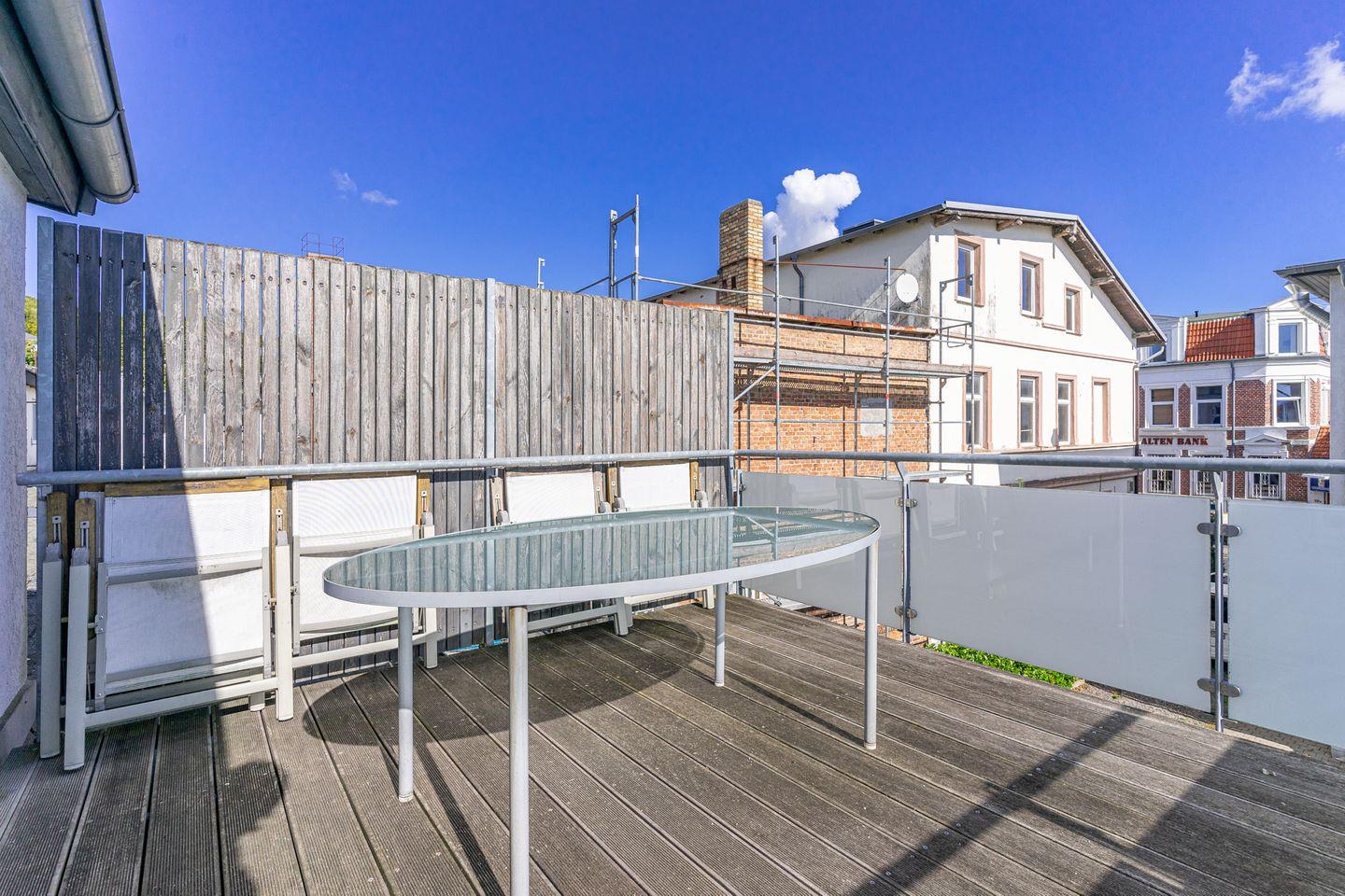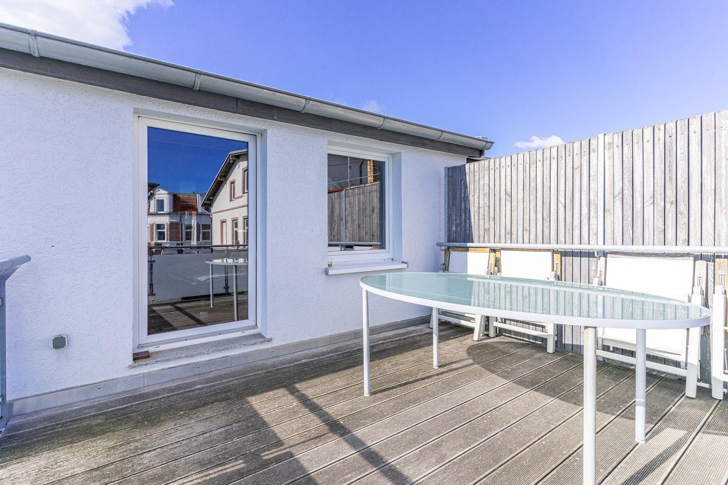 Zur Wohnung gehört eine Dachterrasse mit Gartenmöbeln.