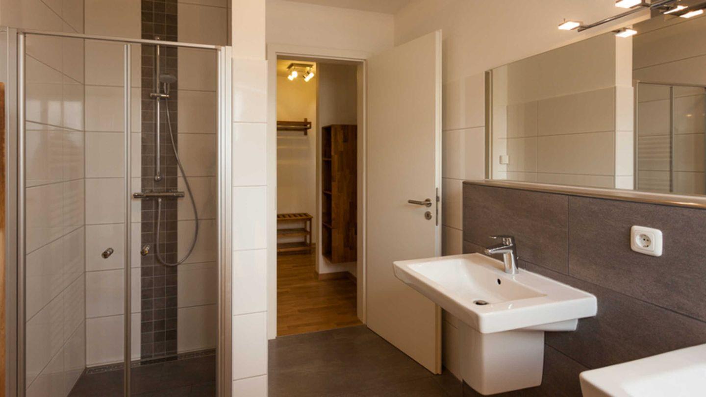 hochwertiges Bad mit bodengleicher Glas-Dusche, Doppelwaschbecken, hochwertige Verfliesung