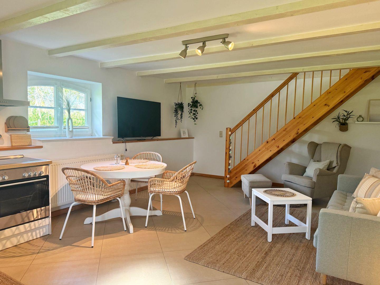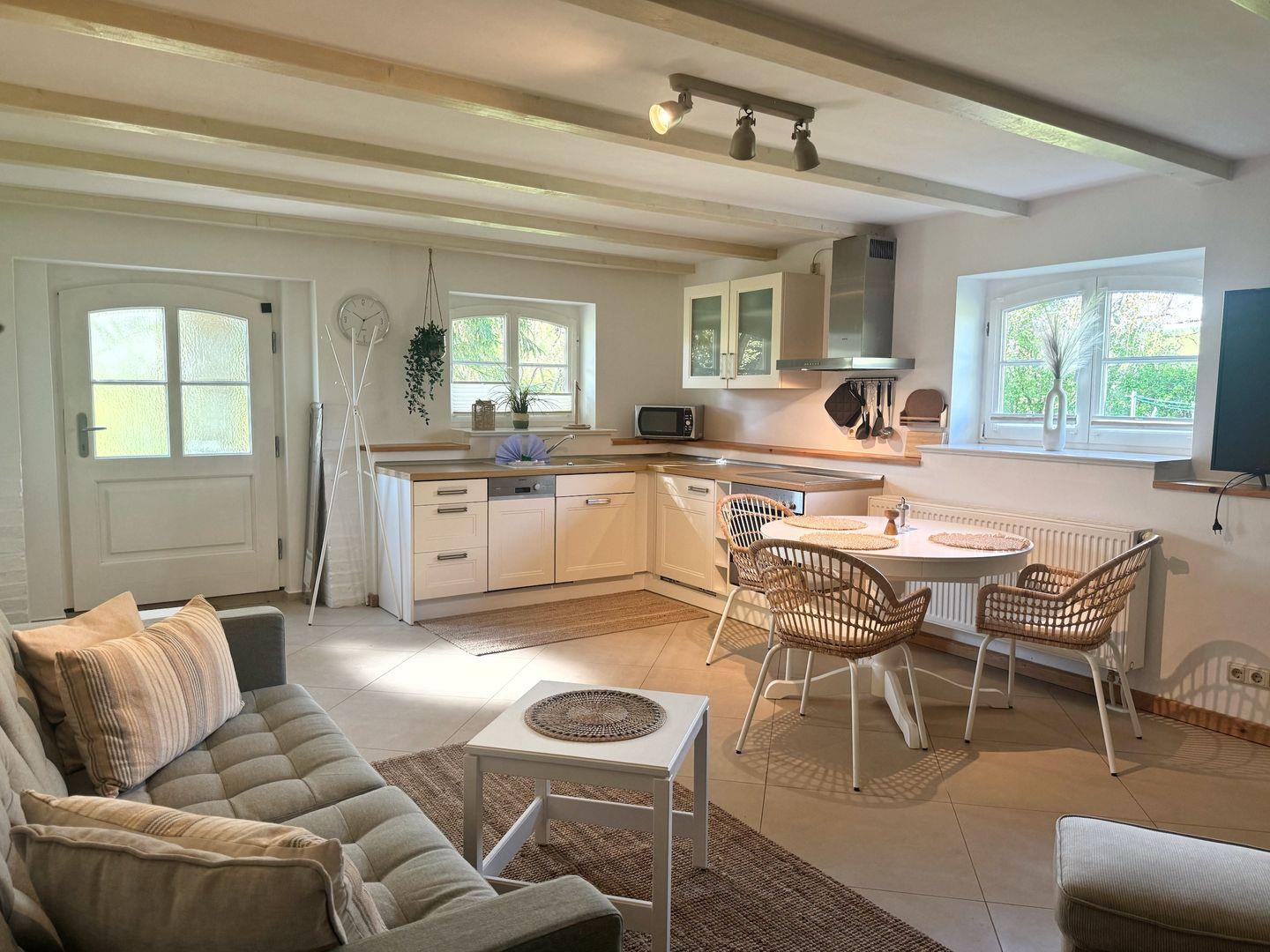 Wasserkocher und Toaster. Neben einem Esstisch gibt es eine gemütliche Couchecke und einen großen Flat-TV. WLAN ist vorhanden.