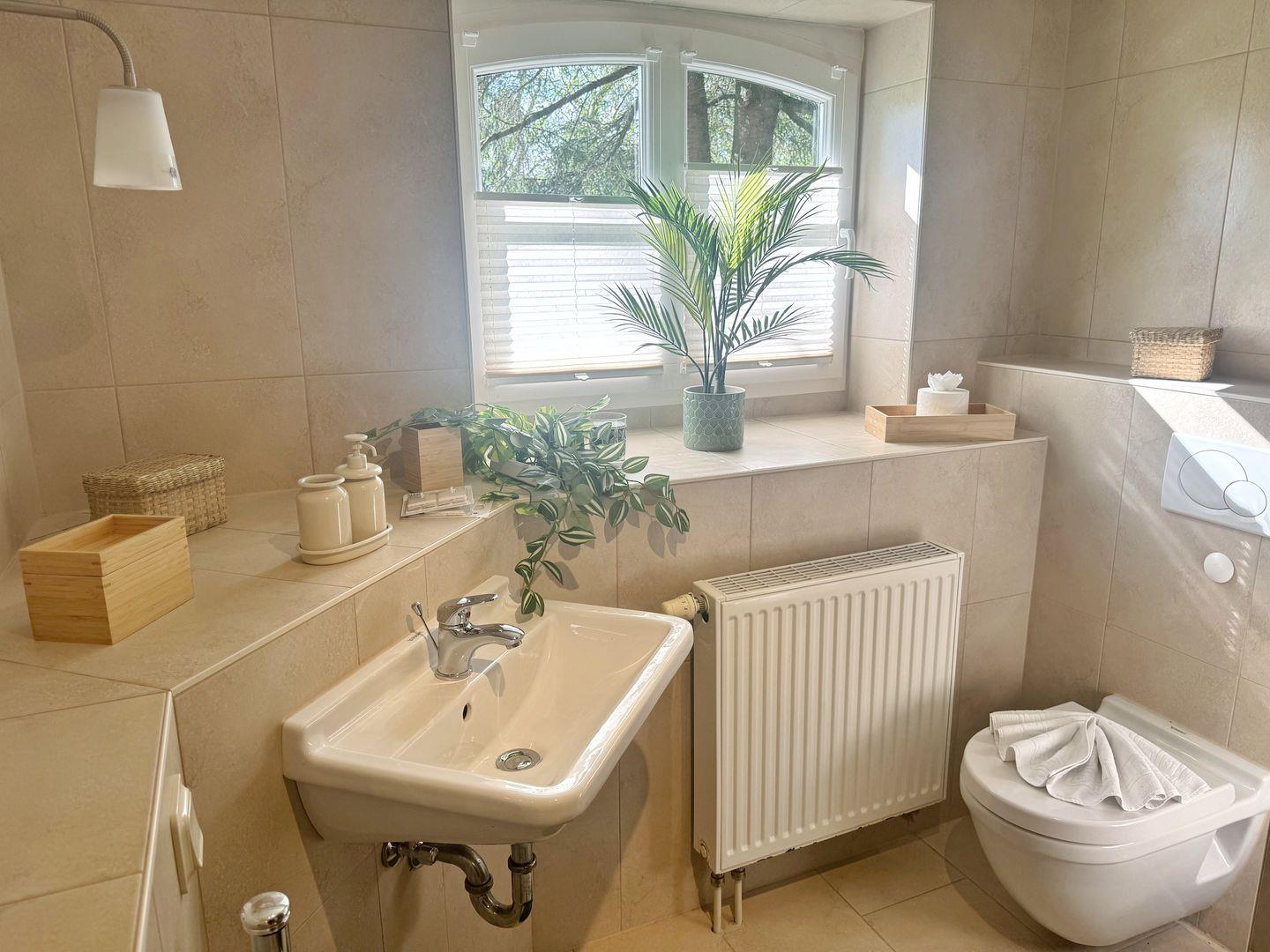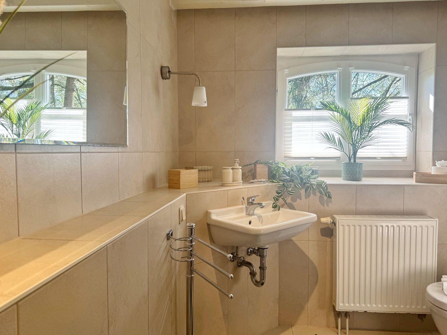 Auch das Badezimmer mit bodengleicher Dusche befindet sich im Erdgeschoß.