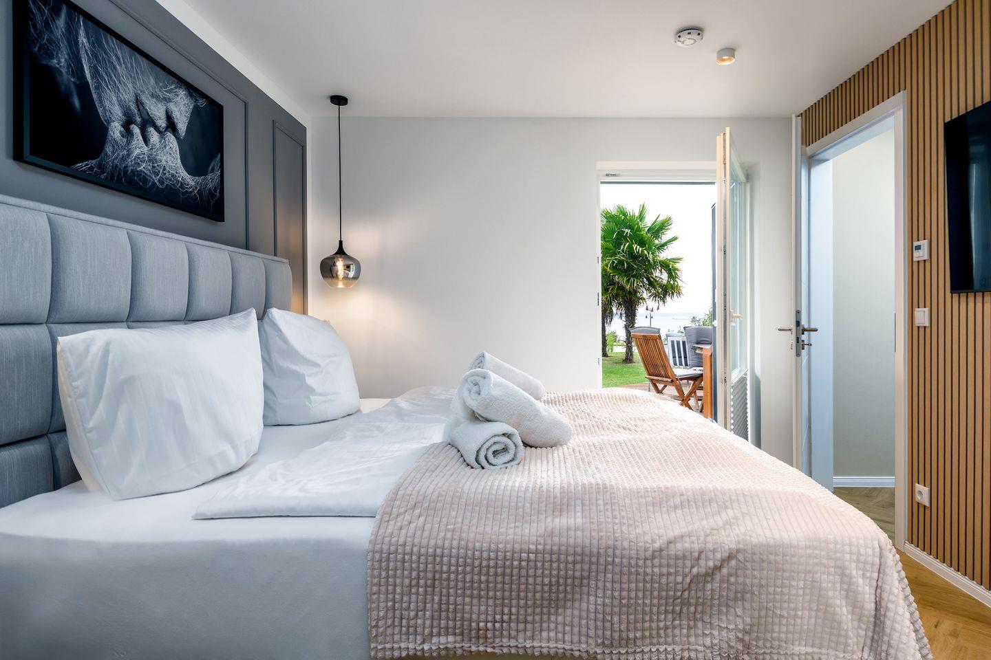 Zwei separate Schlafzimmer – jeweils mit eigenem Bad – sowie ein großzügiger Wohnbereich mit traumhaftem Panoramablick auf die Ostsee und eine voll ausgestattete Einbauküche sorgen für höchsten Komfort.