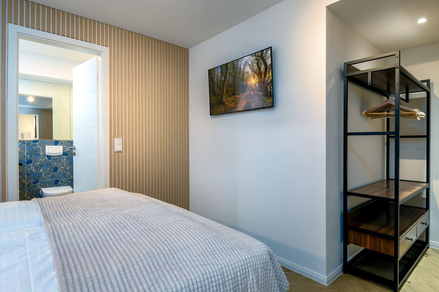 Unsere Gäste haben Zugang zur gesamten Ferienwohnung inklusive Wohnzimmer, zwei Schlafzimmern mit Balkon und Meerblick, dem großzügigen Badezimmer mit Dusche und Badewanne sowie einem separaten WC im Saunabereich.